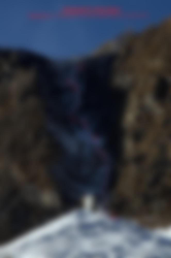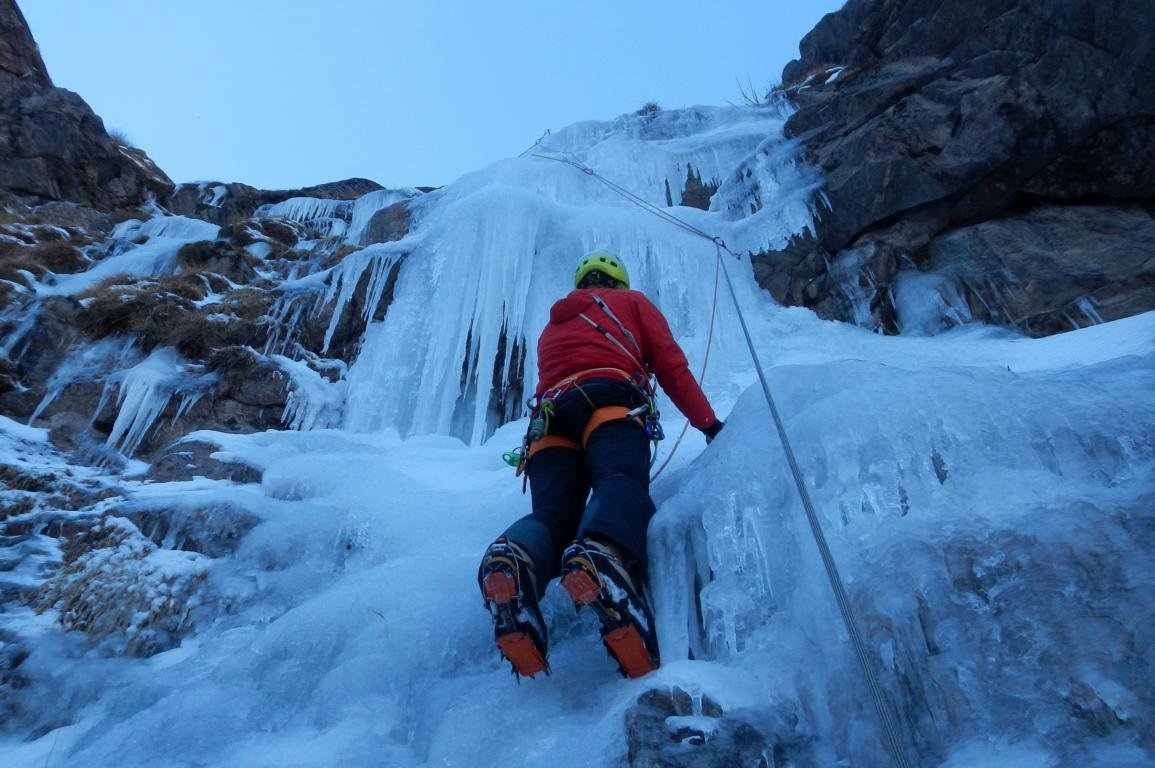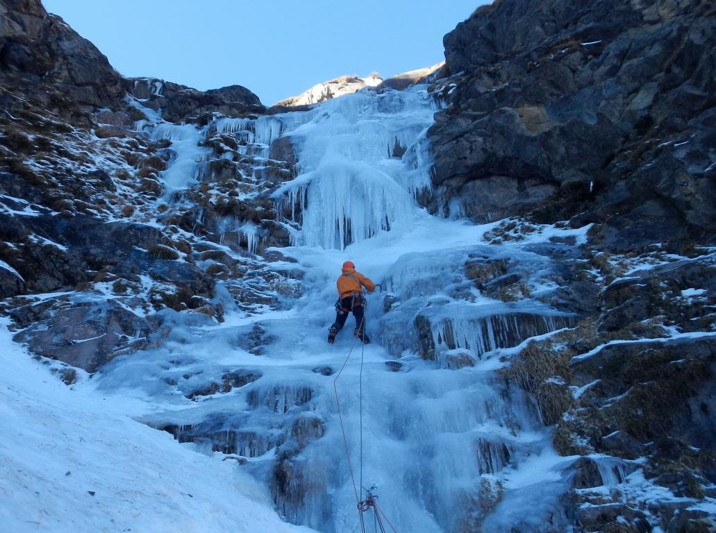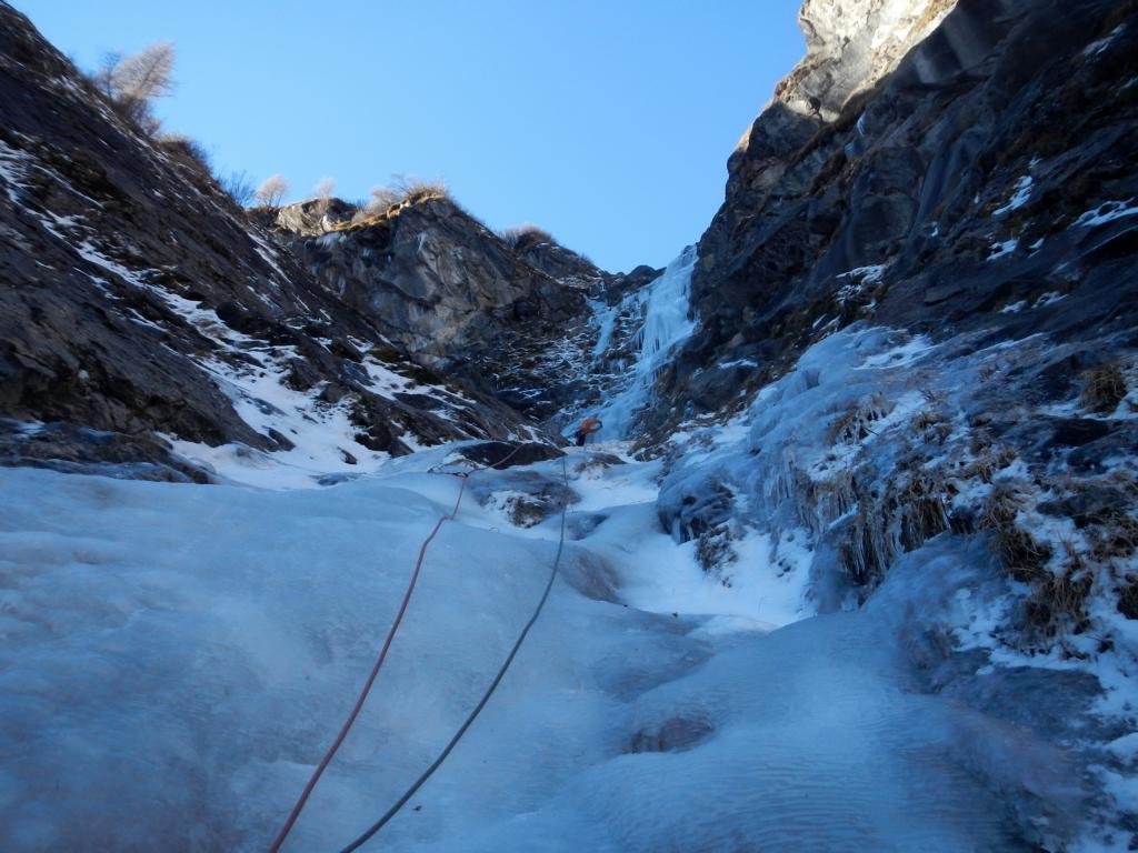 3.Seillänge…die Schneerinne hinauf (nach einigen Metern kann man rechts den Cam legen) in die Eisstufe zu Eisstand (bis Wi2/50m).