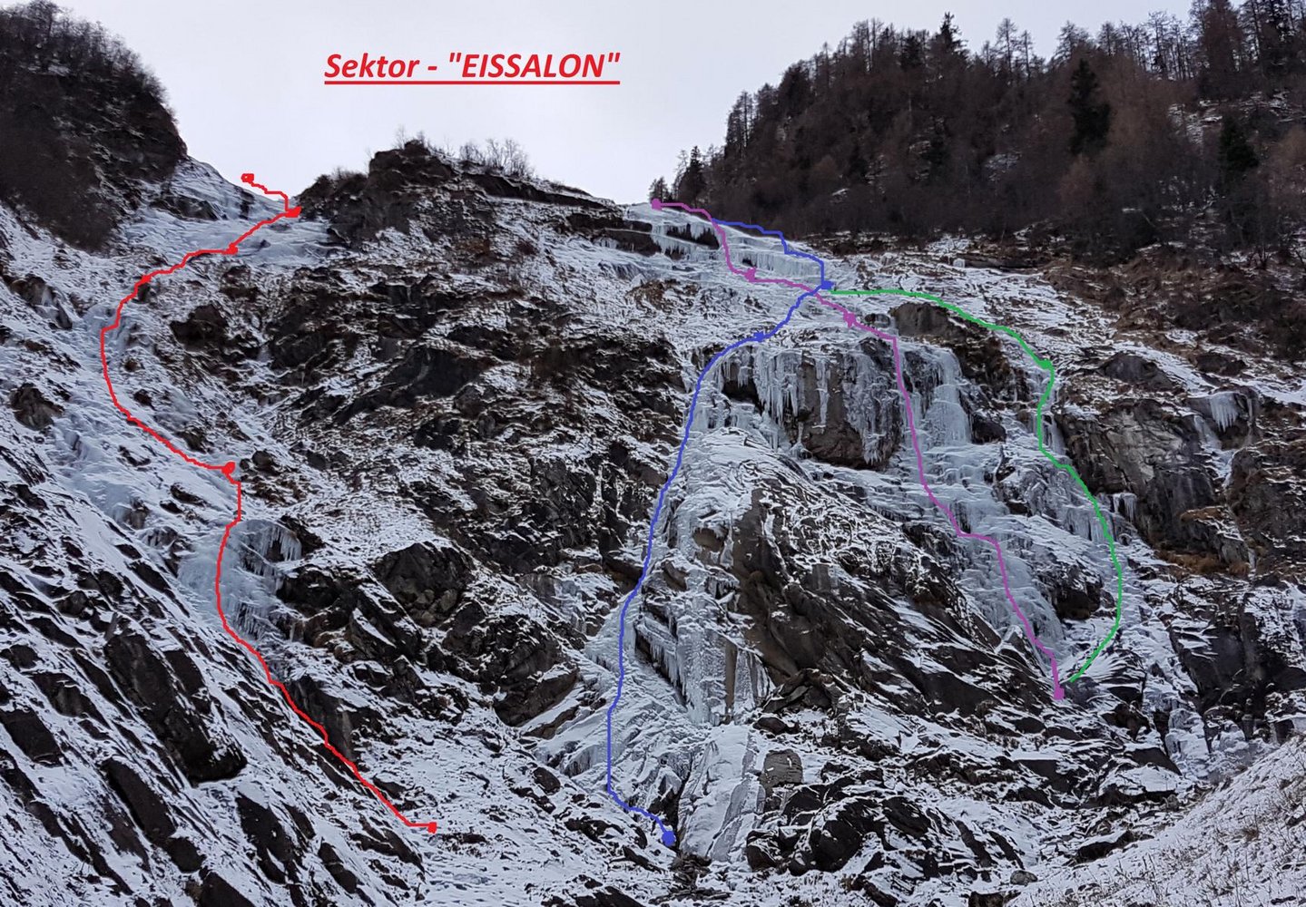 Vier schöne mittellange Eisrouten im Eissalon laden in schneearen Wintern zum chillen ein. Die Routen im oberen Kapruner Tal sind vom Wanderweg einsehbar. Vorsicht: Die Routen sind extrem Lawinengefährdet (teils schon der Zustieg) aus dem teils Sonnen beschienenen Einzug.