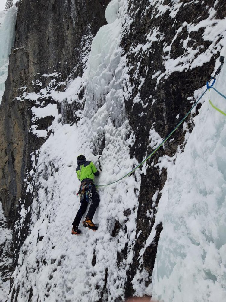 Die erste Seillänge folgt einem überhängenden und sehr splittrigem Riss nach rechts bis man Eis erreicht. Danach folgt in der 2. Seillänge eine dünne Eisglasur (WI 7-)