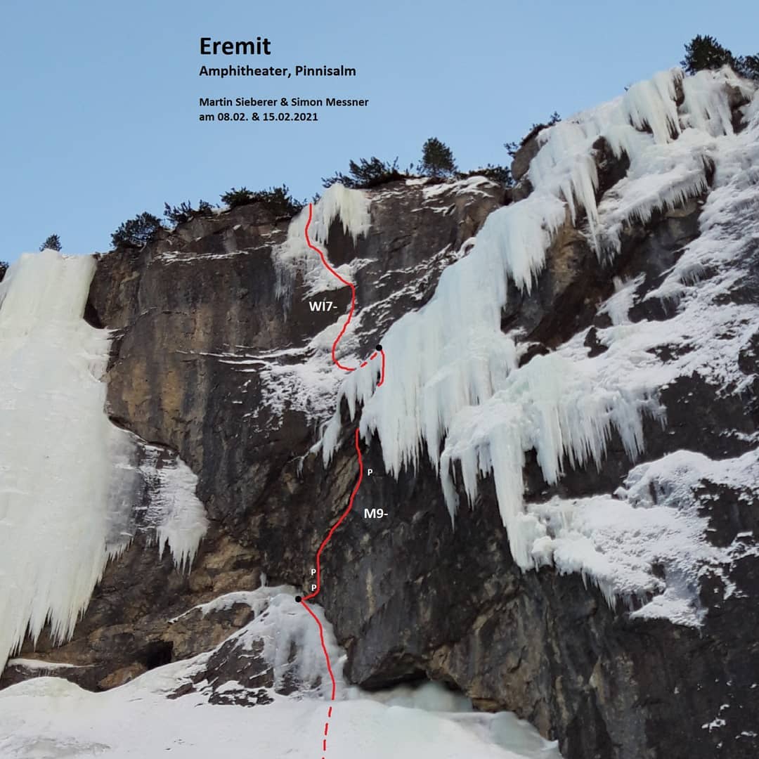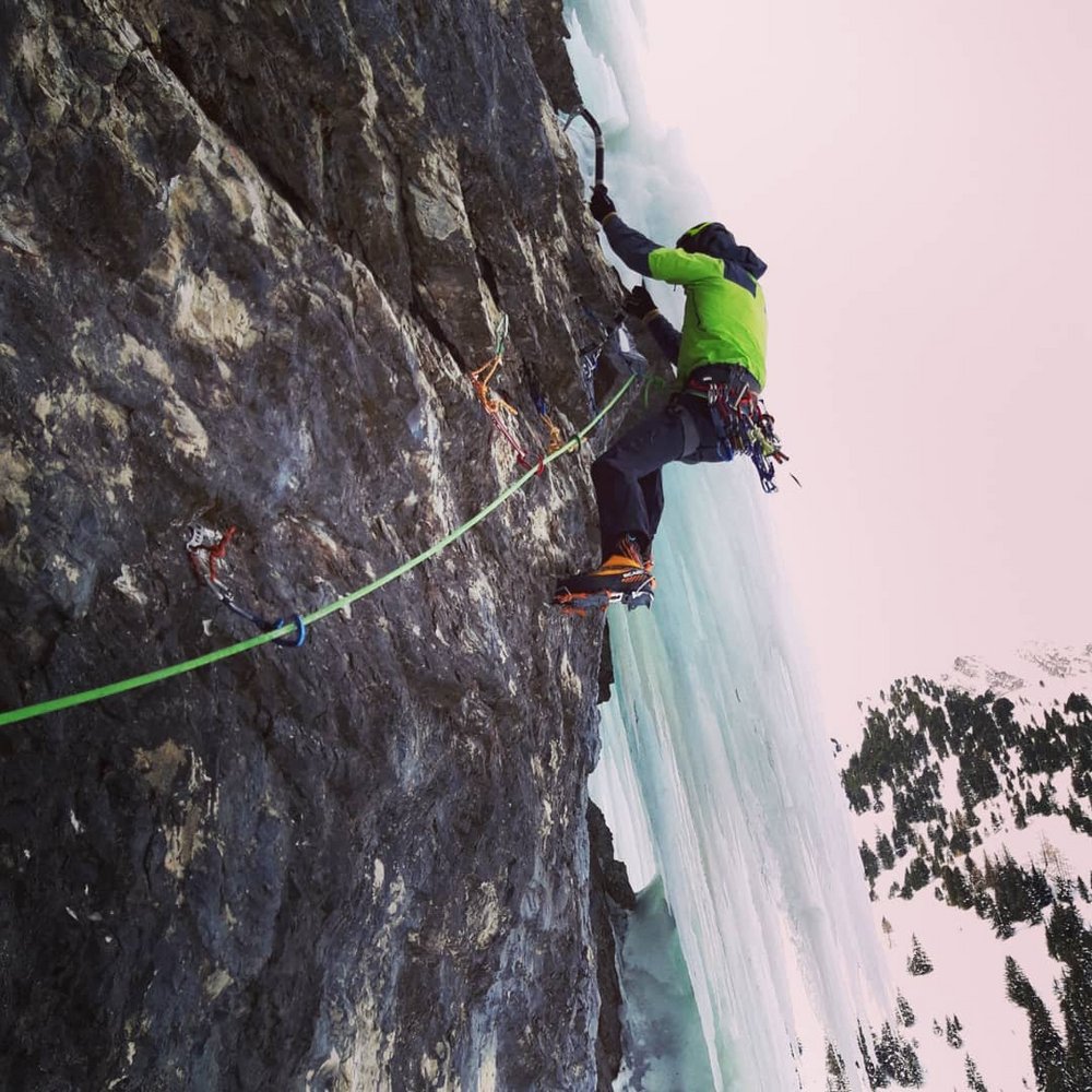 Eine der letzten logischen Eis- und Mixed Linien im Pinnistal. Bis auf zwei Haken und einen Pecker ist die gesamte Route im Trad-Stil selbst abzusichern.