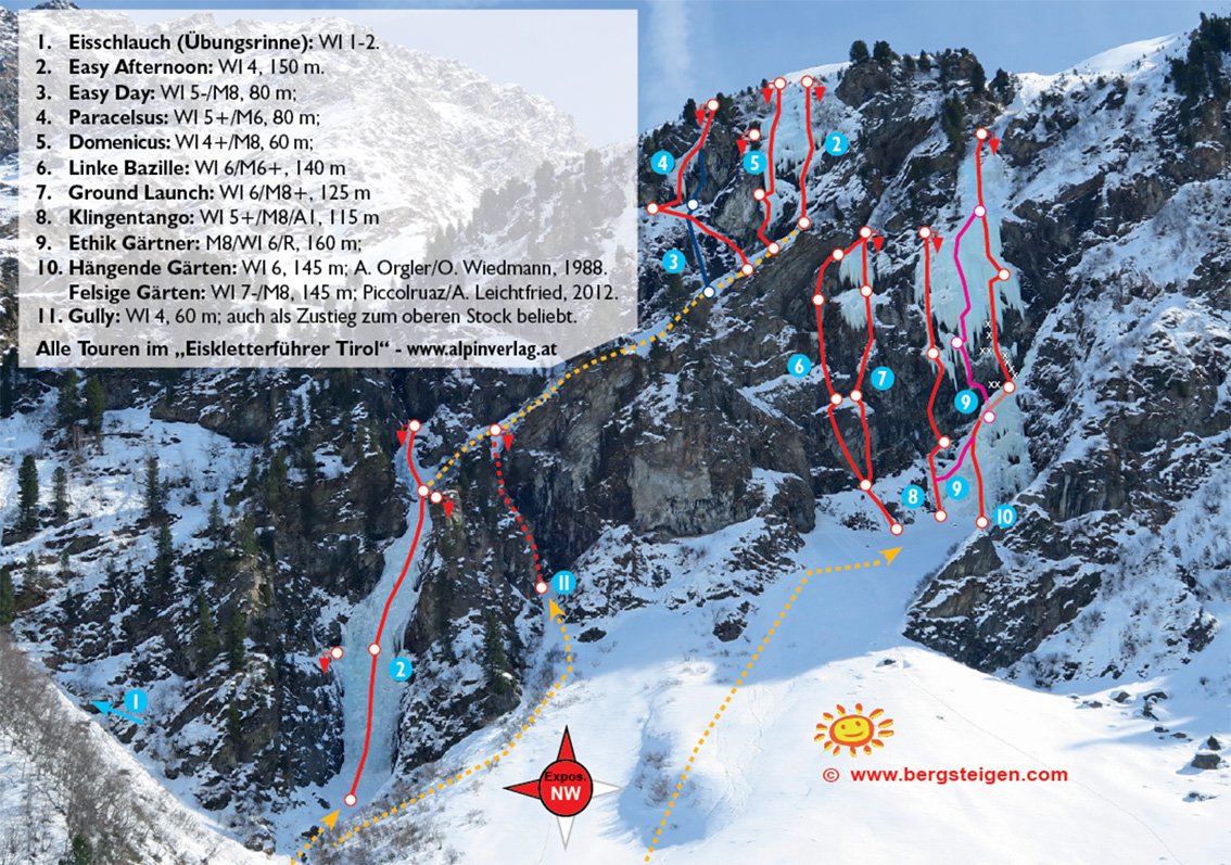 Nachdem sich seit 3 Jahren die klassischen "Hängenden Gärten" nicht mehr gebildet haben, ist stattdessen ein Zapfen 20 Meter weiter links gewachsen, der in Anlehnung an die Ursprünge dieser Wand in traditionellem Stil erstebegangen wurde. 2023 ist der Zapfen gegroundet und wurde am 22.01. von Martin Feistl mit Felix Bub als Säule geklettert (WI 7).