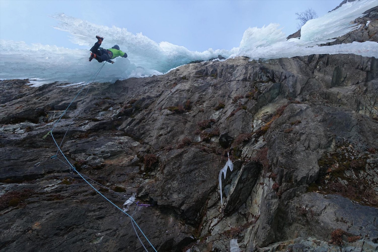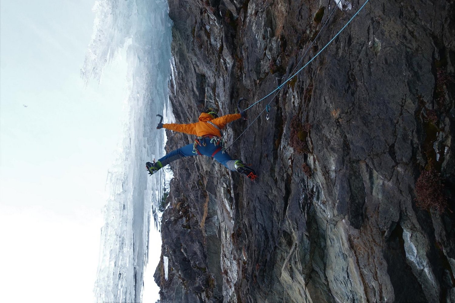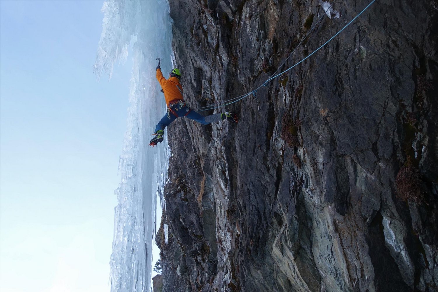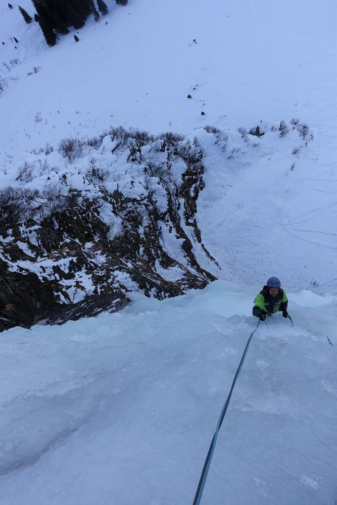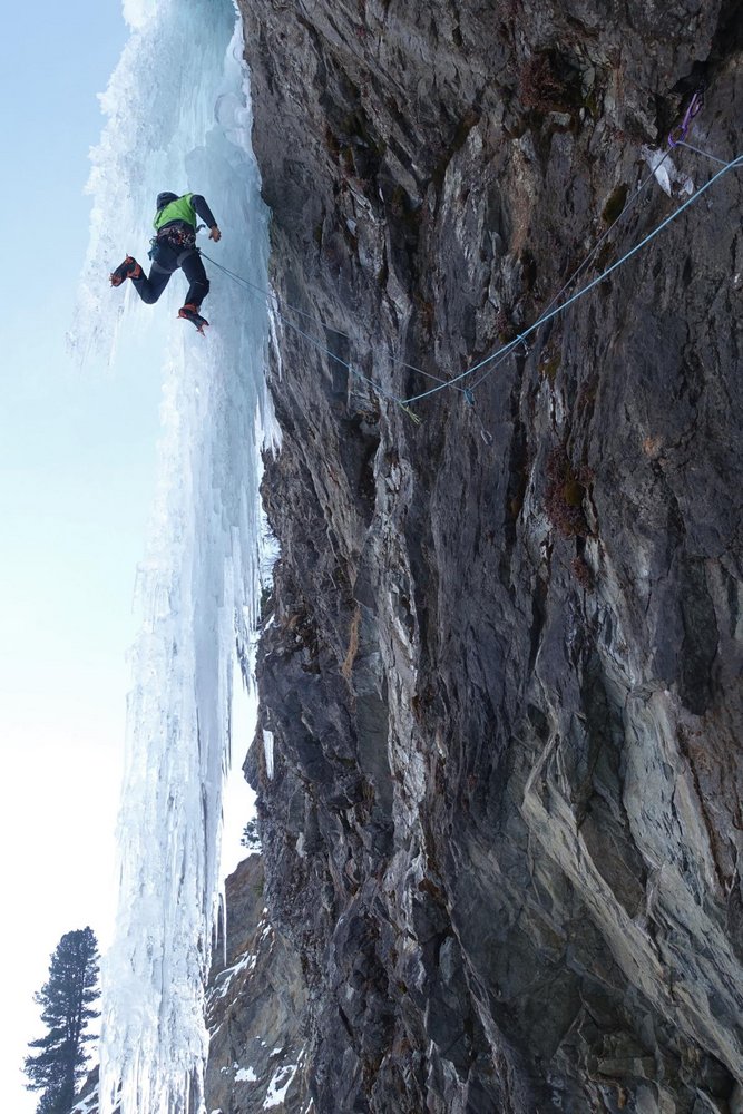Standplatz ober- und hinterhalb des Zapfens beziehen, von dort über einen grünen Salewa Haken, einen lilanen Totem zu 2 Petzl Winkelhaken nebeneinander und einem mit Kevlar und gelbem Karabiner abgebundenen Messerhaken. Von dort Kung-Fu-Kick an den Zapfen und mit Grounder-Gefahr im Nacken hoch. Weiterer Verlauf nach belieben, bei der Erstbegehung war der zweite Vorhang komplett durchgewachsen und wurde direkt geklettert, bei der ersten Begehung im Eis wurde links ausgequert.