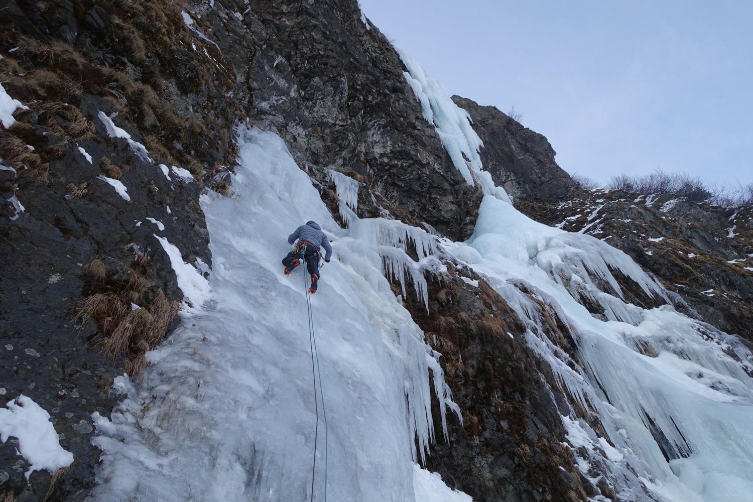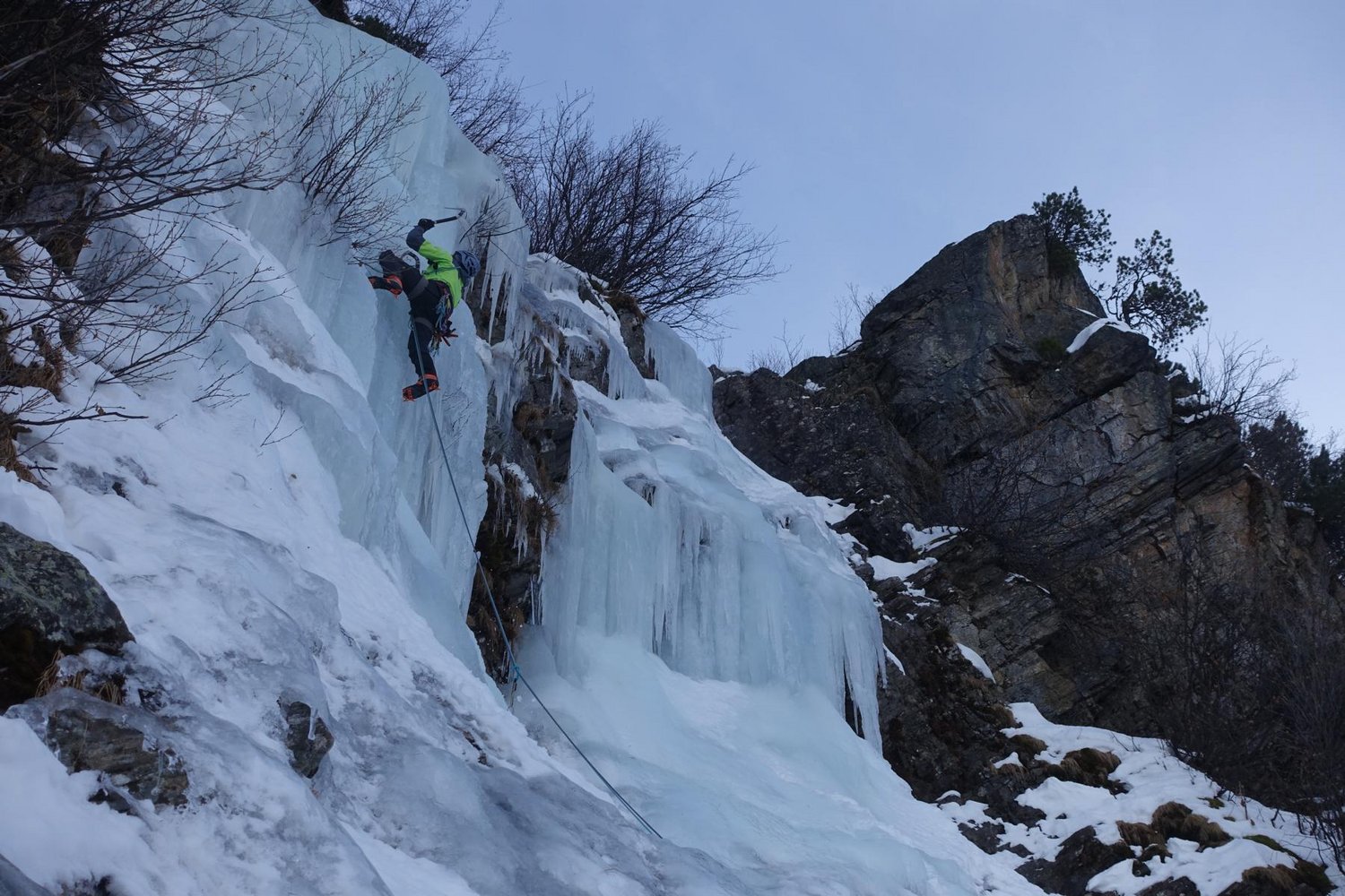 Vom Alpengasthof Lüsens immer auf der Loipe hinein bis man auf der linken Seite denn Fall sieht, von dort direkt hinauf zum Einstieg.