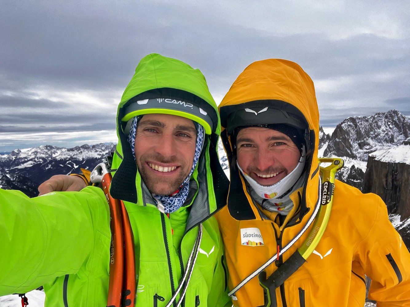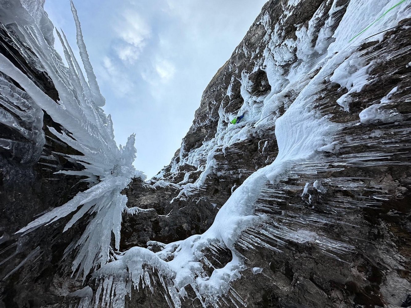 Extrem anspruchsvolle und lange Mixedline in der Pordoi Westwand. Die Route wurde von Simon Gietl und Vittorio Messini an zwei Tagen erstbegangen.