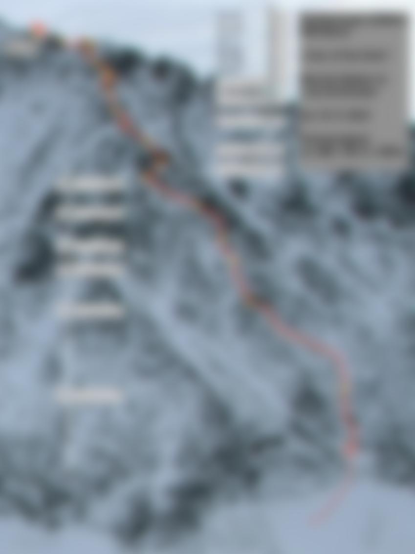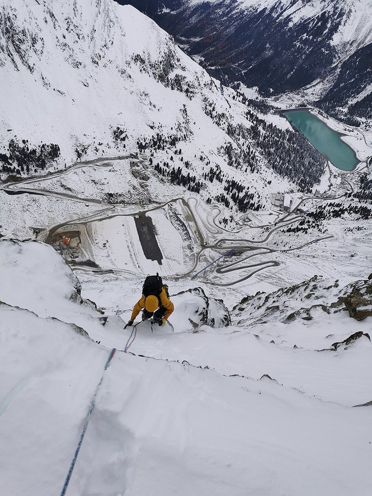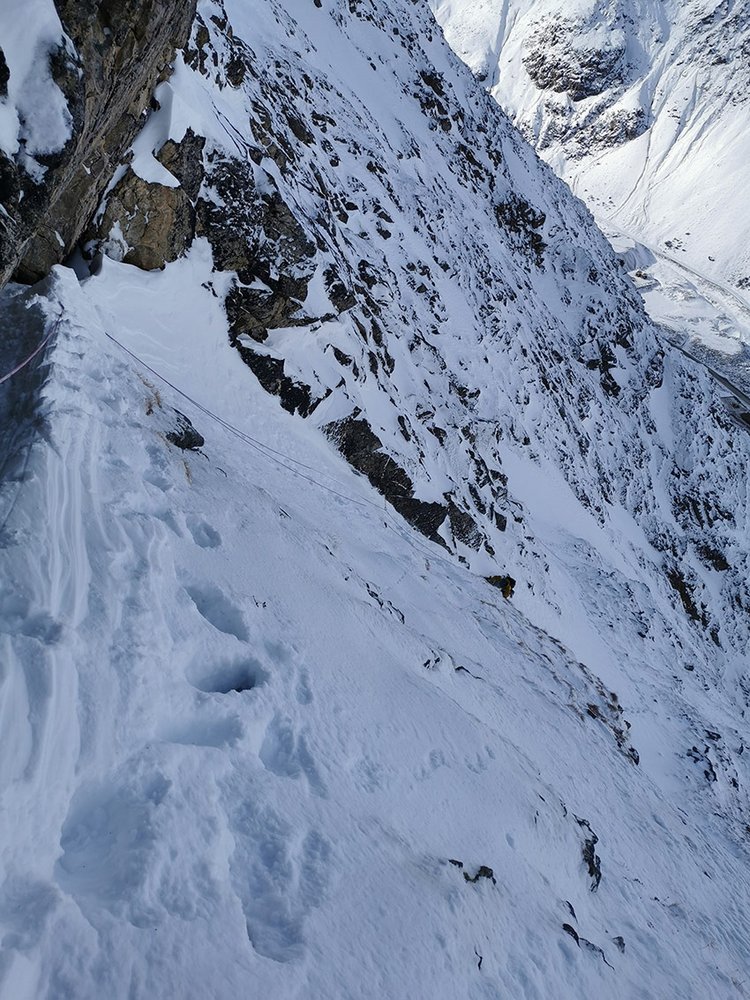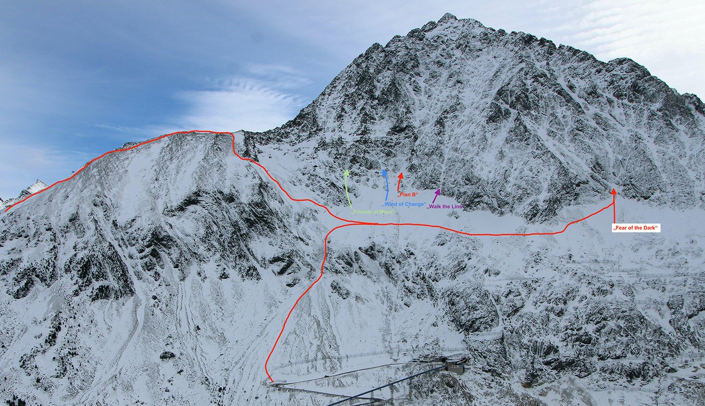 Die Route wurde traditionell erstbegangen und bis auf ein Normalhaken und zwei Fixkeile kein Material in der Wand zurückgelassen. Wiederholer benötigen einen Satz Cams, Keile, Schlingen sowie ein umfangreiches Hakensortiment. Kurze Eisschrauben. Biwaksack und Reserve Akku für Lampe.