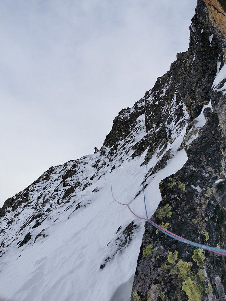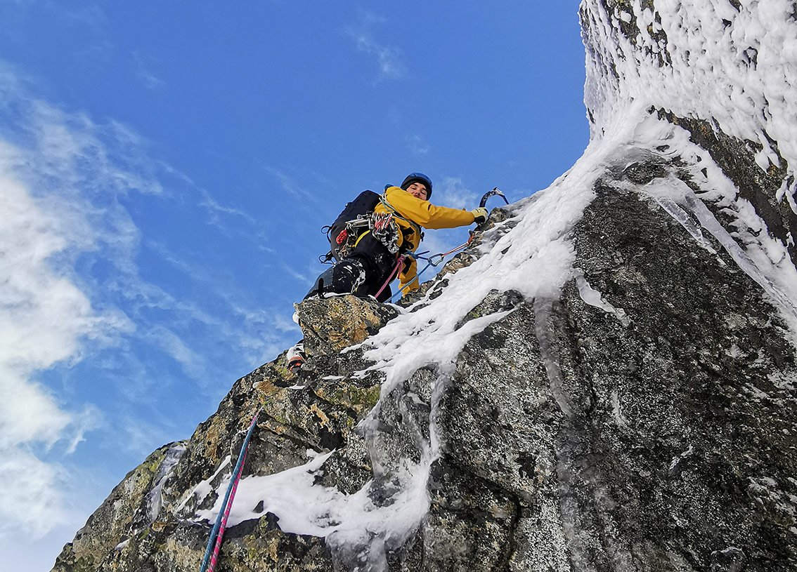 16. SL (60 m, M4+): Wieder auf W-Grat hoch, Gratverlauf folgen und kurz abklettern. Durch zwei Felstürme durch und auf Grat 20 m weiter. Stand vor Aufschwung am Cam und Eisgerät
