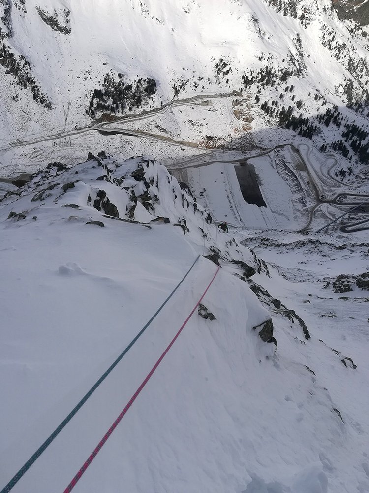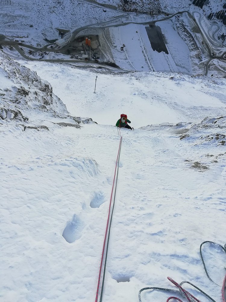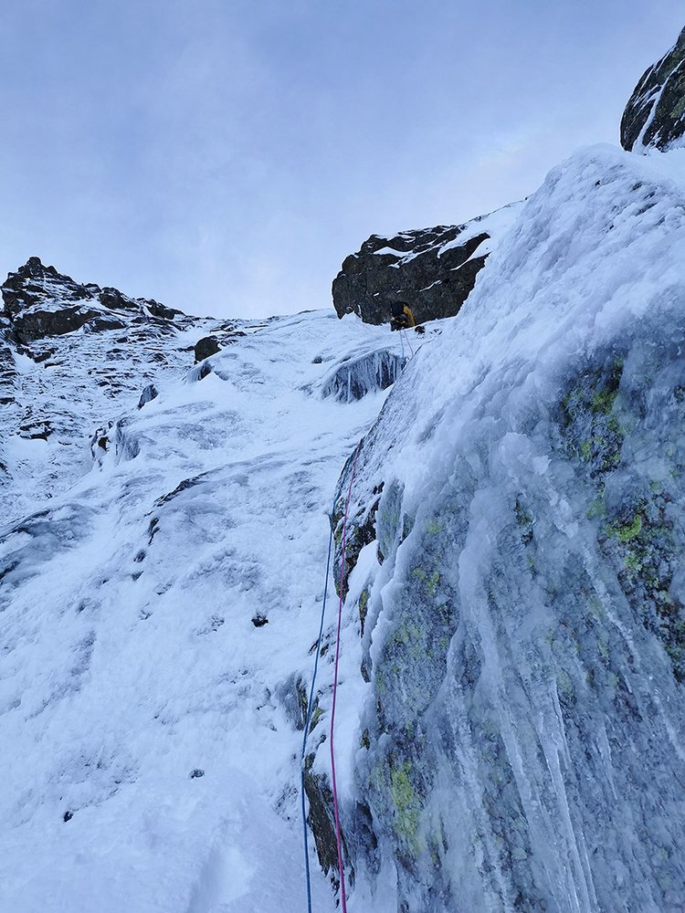 1. SL (60 m, WI 3+/M5-): Durch die Rinne und dünnem Eis links von Felskopf vorbei. Stand in der Rinne an Eisschraube und Eisgerät.