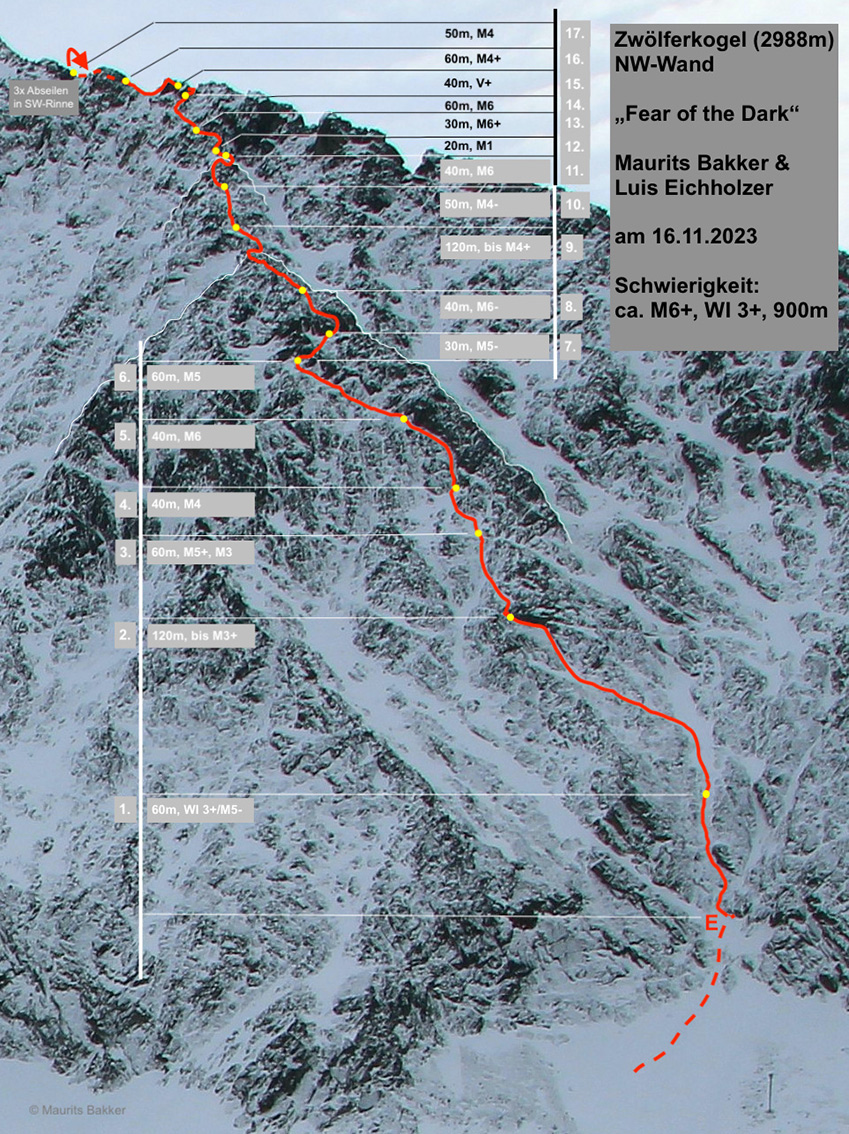 Lange, anspruchsvolle, hochalpine Mixedtour durch den rechten Wandbereich der Zwölferkogel Nordwand (Nordwestwand). Wiederholer sollten über viel alpine Erfahrung verfügen. Die Tour beinhaltet viele kompakte Felsplatten, oft nach unten geschichtet, die teilweise schwer abzusichern sind. Die Felsqualität ist generell gut, in den oberen Passagen teilweise brüchig. Man beachte die Länge der Tour, in der es gerade auch im oberen Teil nicht leichter wird. Ausstieg am Grat auf ca. 2840 m.