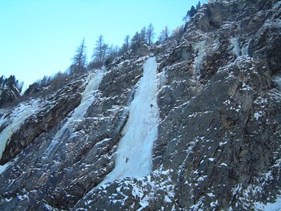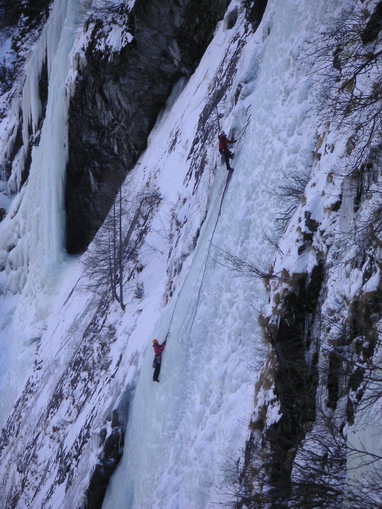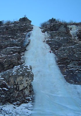 Einer der besten Eisfälle in der Anlauftal-Eisarena, der Fall hat wegen seiner günstigen Lage immer die besten Eisverhältnisse. Der obere Teil (die letzten zwei Längen) wird meist nicht gemacht, da sie im Gegensatz zum unteren Teil eher unlohnend sind..