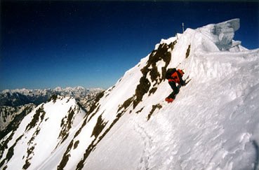 Vom Hauslabjoch leicht ansteigend auf dem Hochjochferner zum Einstieg. Nun nach Überwindung des Bergschrundes durch die steile Firnwand zum Gipfel.