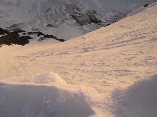 Vom Zenbiwak in Richtung Südost über Geröll kurz abwärts zum Rossbodegletscher. Auf diesem in derselben Richtung wieder bergauf bis zum Plateau des Rossbodegletschers, das nach einer Gletscherkuppe erreicht wird. Da im Bereich dieser Kuppe mit Spalten zu rechnen ist und die nächtlichen Sichtverhältnisse im düsteren Winkel unter der Fletschhorn-Nordwand stark eingeschränkt sein können, empfiehlt sich besonders bei fehlender Trasse die wenig zeitraubende Anlage einer brauchbaren Spur am Vortag (ca. 20 Minuten vom Zenbiwak). Hat man das Gletscherplateau erreicht, hält man sich in südlicher Richtung auf die Wand zu.