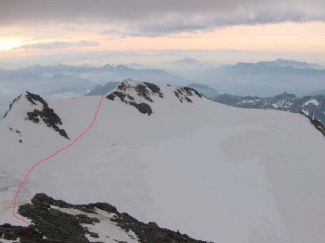 Einstieg zur Eiswand am Plateau des Rossbodegletschers auf etwa 3200 m. Ein erster, größerer Bergschrund wird zumeist problemlos überschritten, weitere kleinere Schründe in der Folge ebenso. In diesem Wandteil steigt man leicht links der von unten sichtbaren Felsinsel gerade aufwärts. Auf ca. 3500 m erreicht man den oberen Rand dieser Felsinsel in Wandmitte (bis hierher etwa 40 – 45 Grad). Danach wird die Wand etwas steiler (45 – 50 Grad). Ab hier bestimmen die jeweils herrschenden Verhältnisse den Weiterweg durch die Wand. Es empfiehlt sich, die Wegführung nach den Durchschlupfmöglichkeiten durch die Séracs am Nordwestgrat auszurichten. Die besten Möglichkeiten hierfür finden sich zumeist im rechten Ausstiegsbereich der Eisflanke, und zwar knapp links der von unten sichtbaren Felsen unter dem Nordwestgrat (ziemlich gerade oberhalb der Felsinsel), oder im steileren Wandteil etwa hundert Meter weiter links davon, also am rechten Rand des eingangs erwähnten Eisabbruchs. Die rechte Variante erreicht am Ausstieg eine Steilheit von ca. 50 – 55 Grad, die linke Variante ist geringfügig steiler (etwa 55 – 60 Grad) und macht die Eiswand aufgrund des höheren Ausstiegs um ca. 50 Meter länger. Der Bereich zwischen den beiden Ausstiegen ist häufig von Wechten überdeckt und für Ausstiegsmanöver nur bedingt geeignet. Nach dem Verlassen der Wand folgt man dem Nordwestgrat unschwierig auf den Gipfel. Kletterzeit Einstieg - Gipfel: 2 - 4 Stunden.