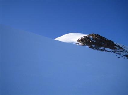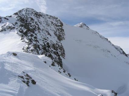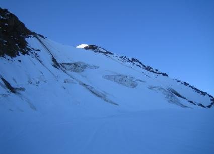 Am Einstieg von links kommend bis etwa unter die Wandmitte queren, um den potentiell durch Steinschlag und durch Wächtenbruch gefährdeten Bereich im linken Wandteil zu umgehen. Aufstieg zum Bergschrund, der die Wand nach dem unteren Drittel durchzieht, ebenfalls mittig. Die große Spalte am Bergschrund läßt sich auf einer Rampe, die schräg von links unten nach rechts oben ansteigt, sehr gut überwinden (je nach Schneelage bzw. Eisbildung). In diesem Bereich und leicht oberhalb ist auch die steilste Stelle der Wand (ca. 60 °). Nach dem Bergschrund fast direkt, leicht nach rechts ziehend auf den Grat nach oben. Auf dem Grat nach rechts unschwierig zum höchsten Punkt.
