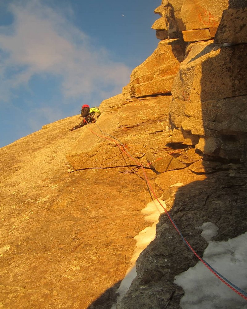 Sehr lohnende und, in diesem Gelände, einzigartige mixed Route an der Nordwestwand der Winkelspitze. Die Tour ist mit 300m und 6 Seillängen nicht zu lang aber sie sollte nicht unterschätzt werden. Die Richtung von der Route ist von der markanten Verschneidung und von den Dächern gegeben, die diesen Wandteil charakterisieren. Vom Eisklettern am dünnen Eis mit begrenzten Sicherungsmöglichkeiten und vom kombinierten Klettern mit viel Platz für mobile Sicherungen, bis zur reinen Felskletterei im schönen Granit, "Fragments of light" bietet eine abwechslungsreiche Nordwestwandkletterei in einem grandiosen hochalpinen Ambiente.