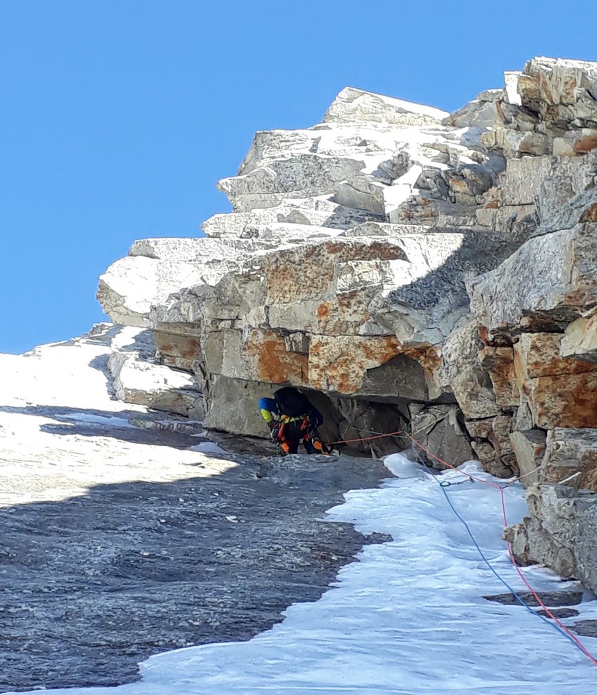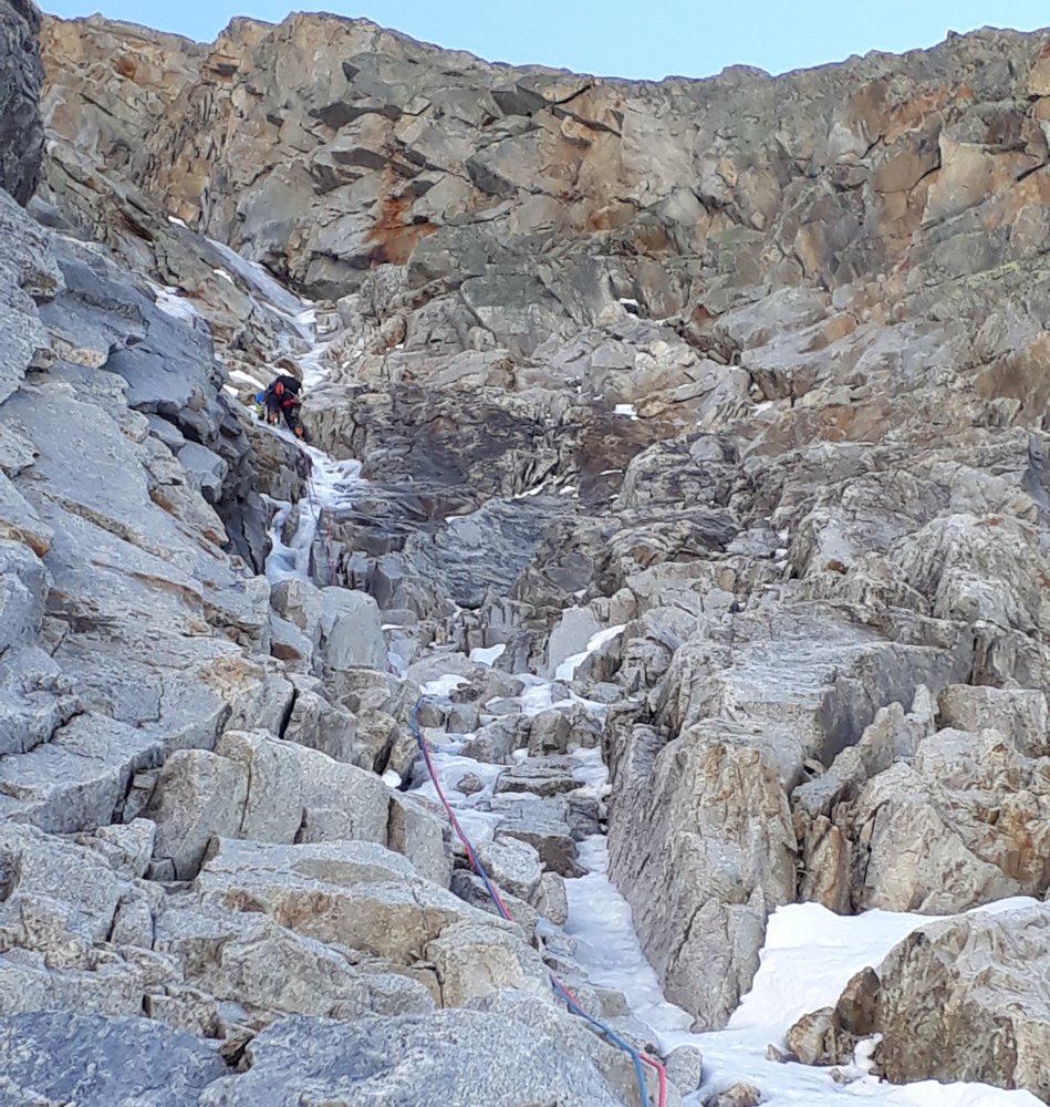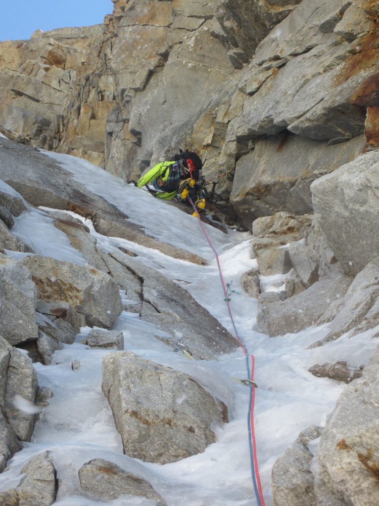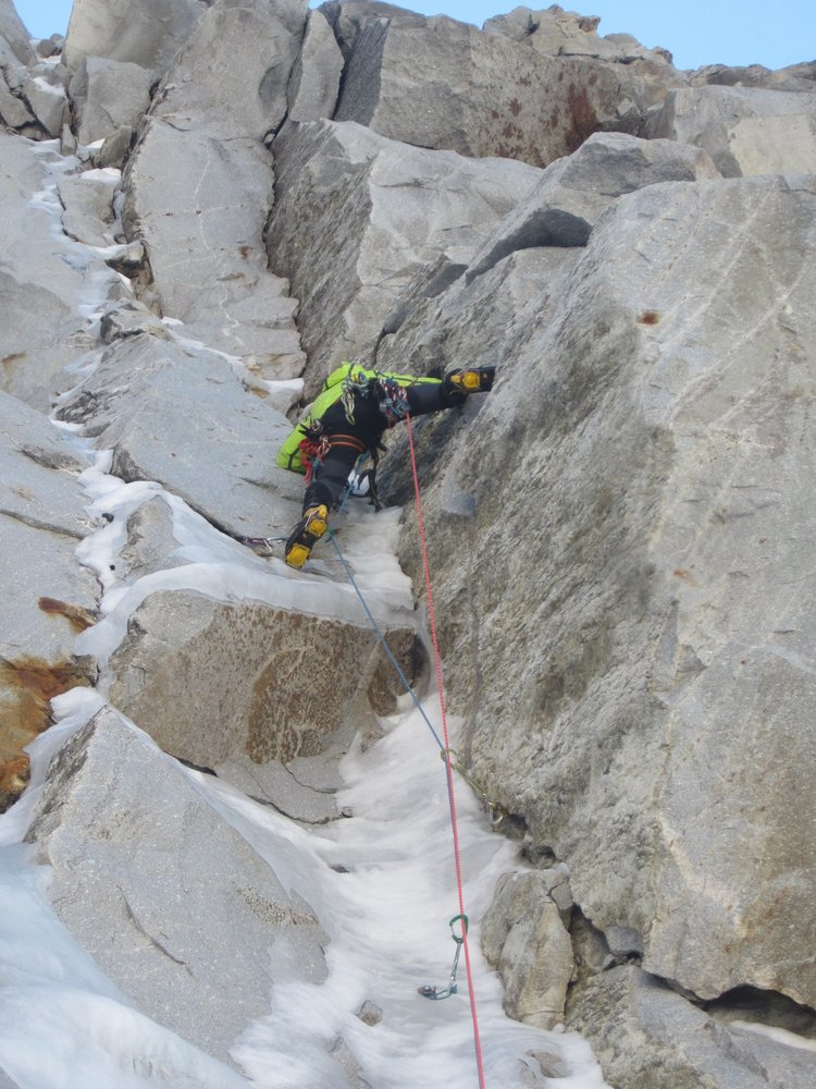 5. SL.: Vom Stand 2 Meter hoch, 3m links auf Reibung, den schönen Riss hinauf. Nach 15m ist der Riss für 10 weitere Meter mit einer 15 cm dicken Schicht Eis überzogen und man klettert verschneidungsmässig. In der Verschneidung bleiben, leicht nach rechts weiterklettern und den kleinen Überhang hinauf (1NH) bis zum Stand mit 2 NH. 55m, V. (Da die Wand links vom Riss am Anfang ziemlich glatt ist und viele Reibungstritte hat, wurde diese einzige Länge im Vorstieg mit Kletterschuhe geklettert.)