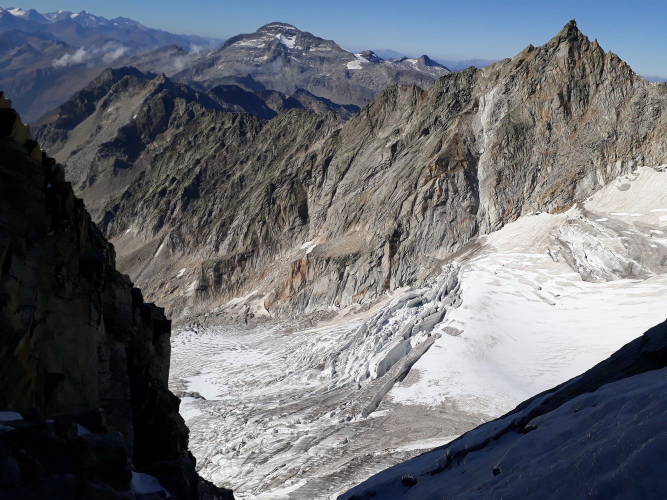 Der Einstieg der Route ist nicht beim Zustieg zu sehen und befindet sich an der Nordwestwand der Winkelspitze bei ca. 3050m. In der Wandmitte sieht man die markante Verschneidung, die bis zum Grat führt.