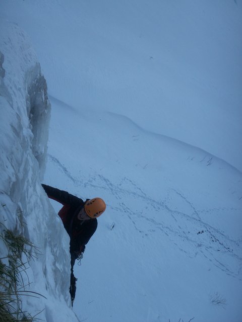 "Direktes Gaisloch", WI 4, 60 m. Die direkte Variante- auch als "soft ice" bekannt- weicht den großen Vorhängen links aus und endet in der großen Höhle (Erstbegeher: James Skone, 1977).