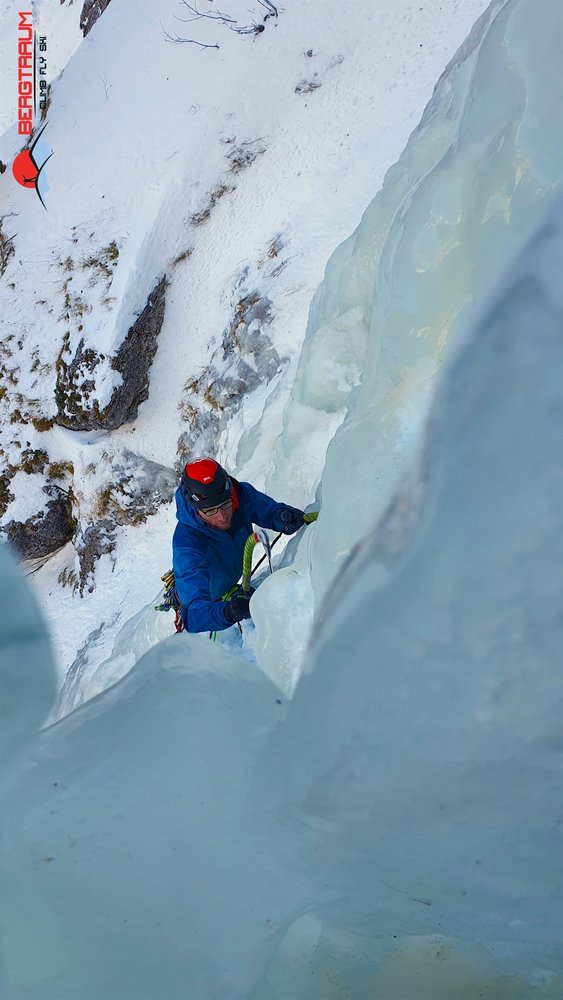 "Gerades Gaisloch", WI 5+, 120 m. Die zentrale, am direktesten zu kletternde Linie bis ganz hinauf. Im zentralen Wandteil wartet die spektakuläre Kerze auf den Kletterer.
