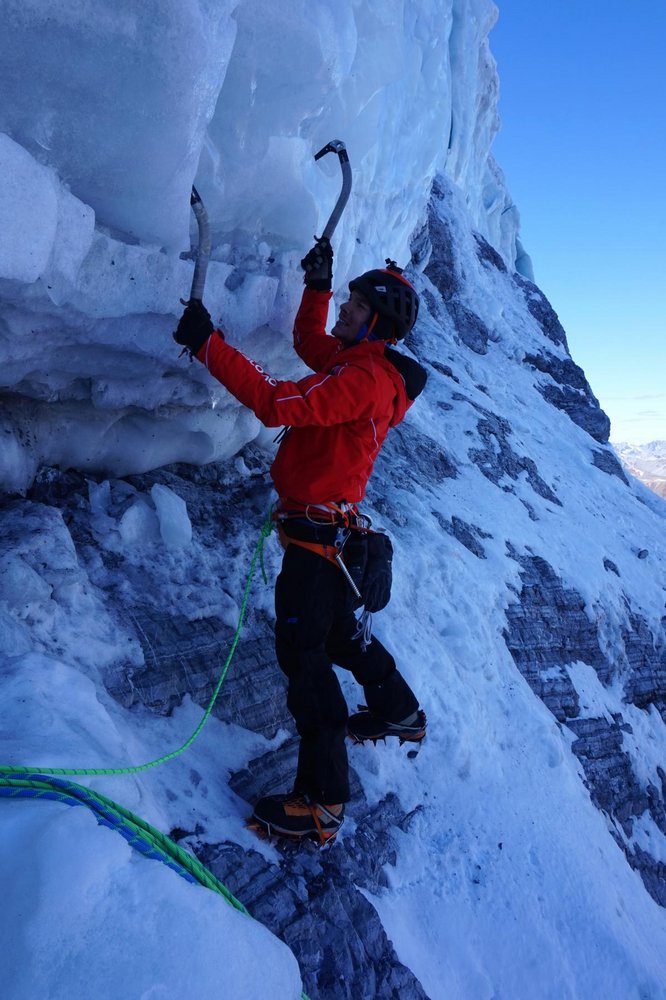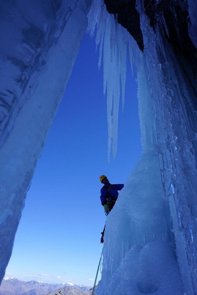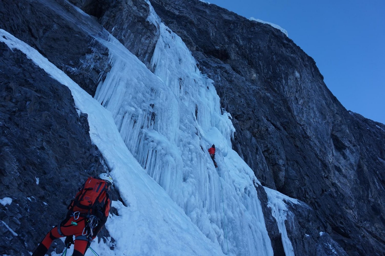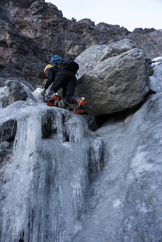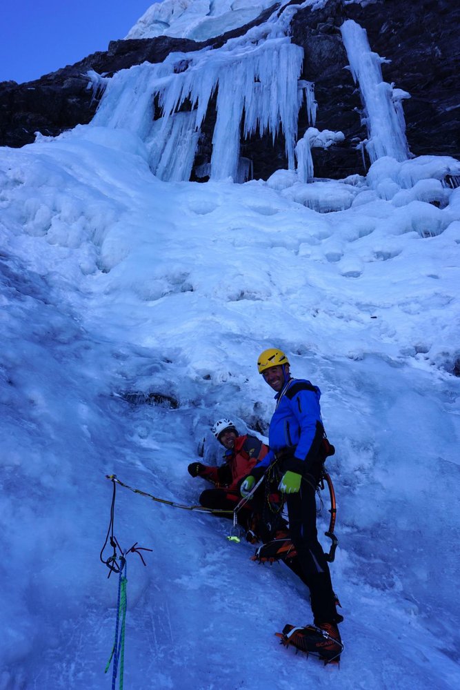 Sehr ernsthafte und gefährliche Kletterei über einen 200 Meter nicht immer gefrorenen Wasserfall und 100 Meter über Seracs als Bonus. Die Route ist objektiv gefährlich wegen Steinschlag am Zustieg und den über der Wand liegenden Seracs.