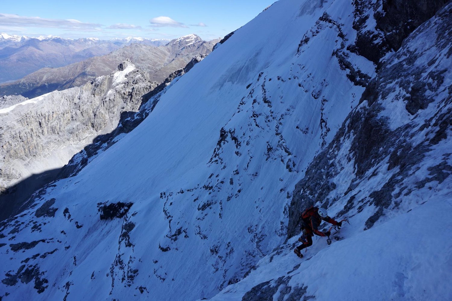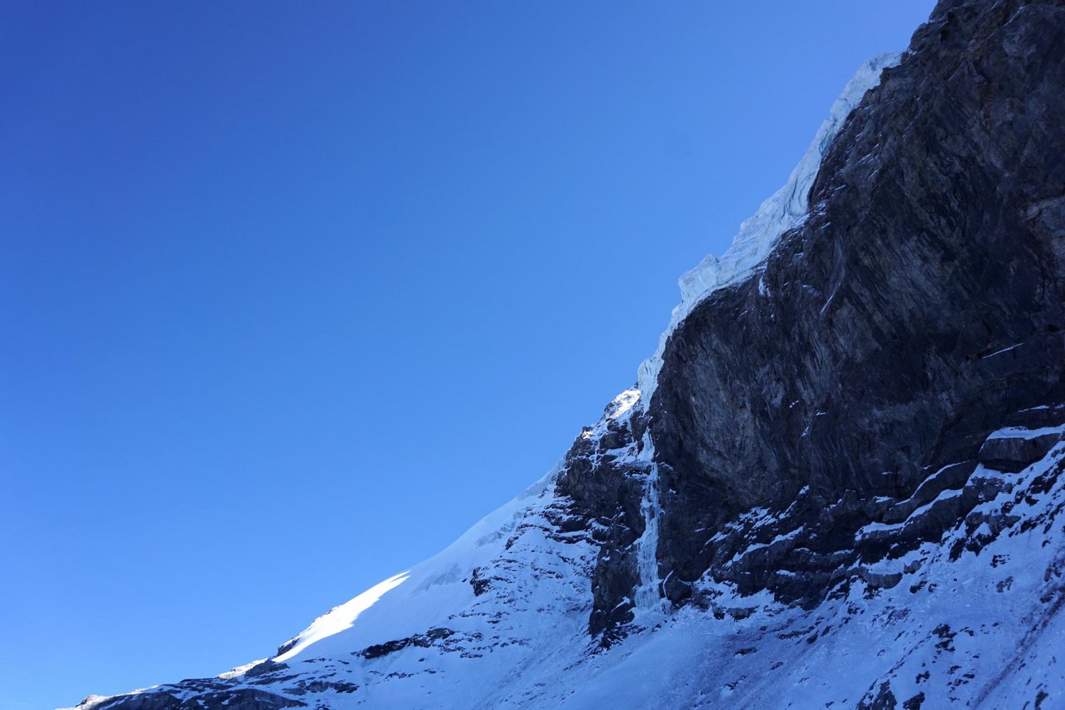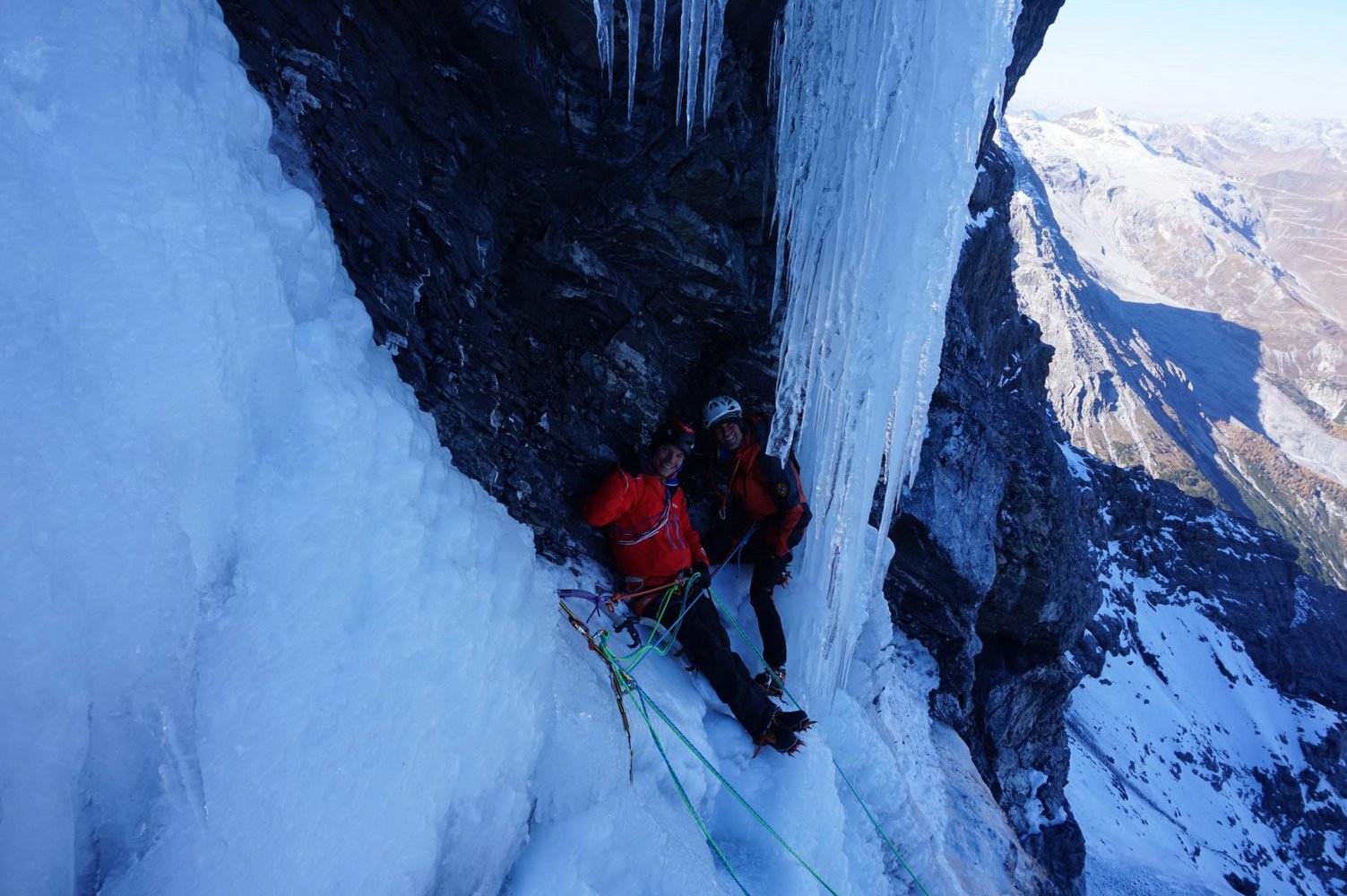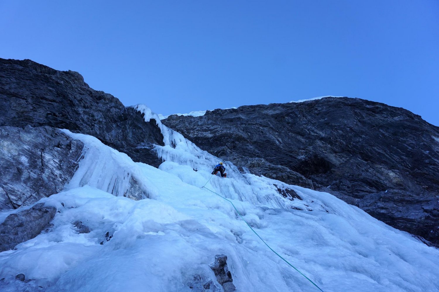 Sehr ernsthafte und gefährliche Kletterei über einen 200 Meter nicht immer gefrorenen Wasserfall und 100 Meter über Seracs als Bonus. Die Route ist objektiv gefährlich wegen Steinschlag am Zustieg und den über der Wand liegenden Seracs.