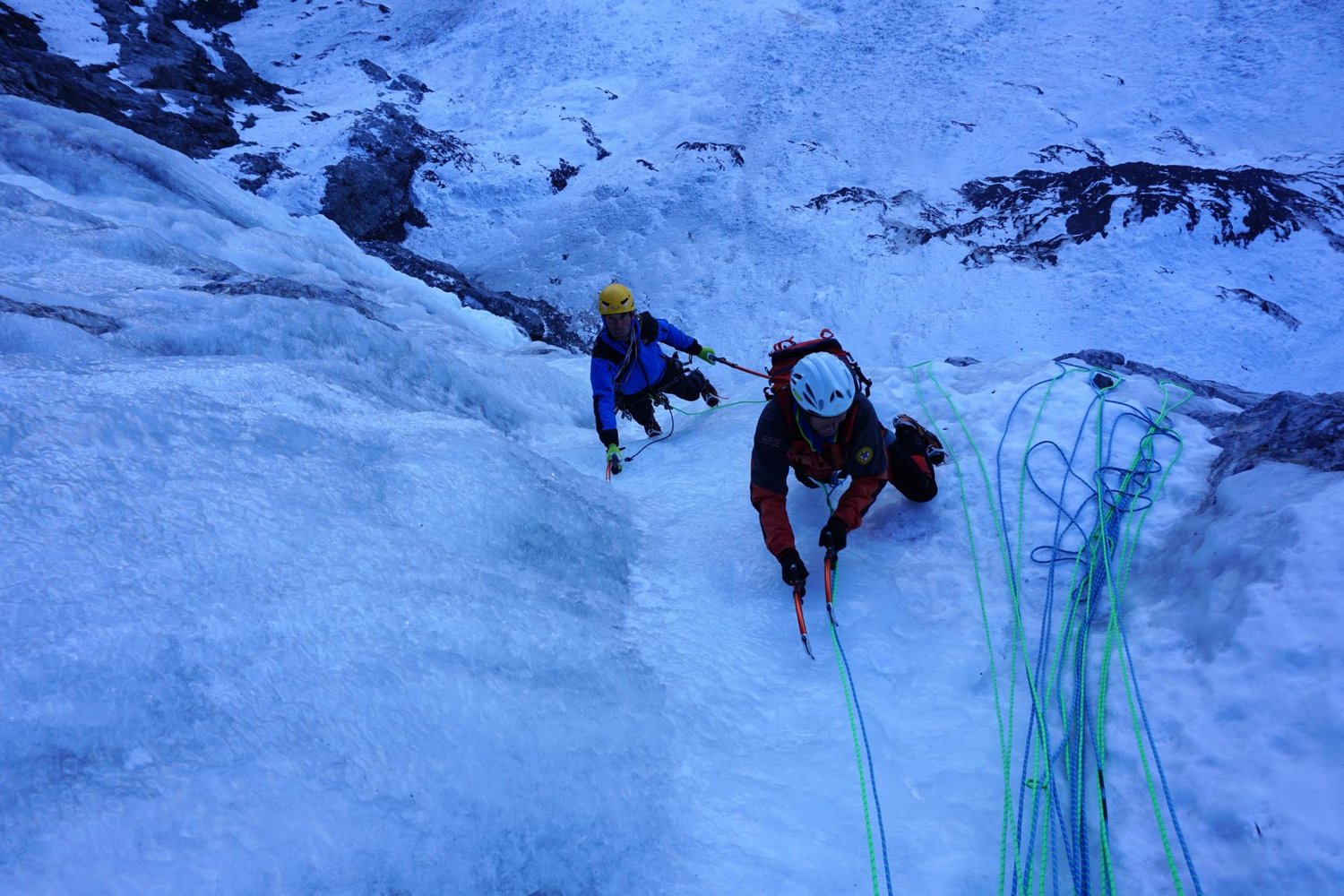 2x 60 m, klompette Eisausrüstung, Abakalov-Schlingen