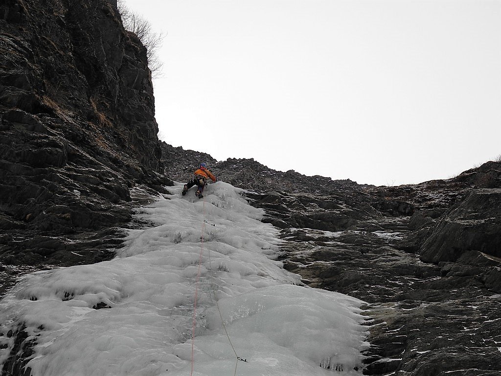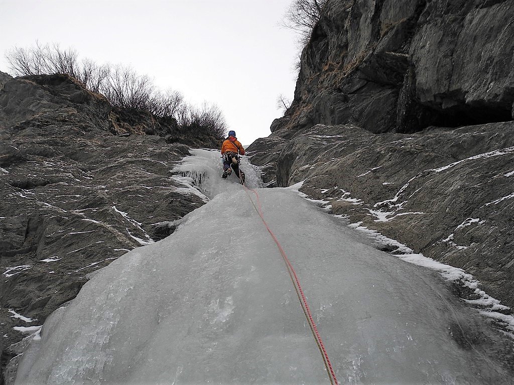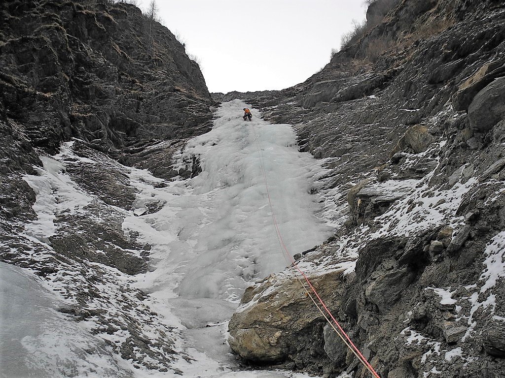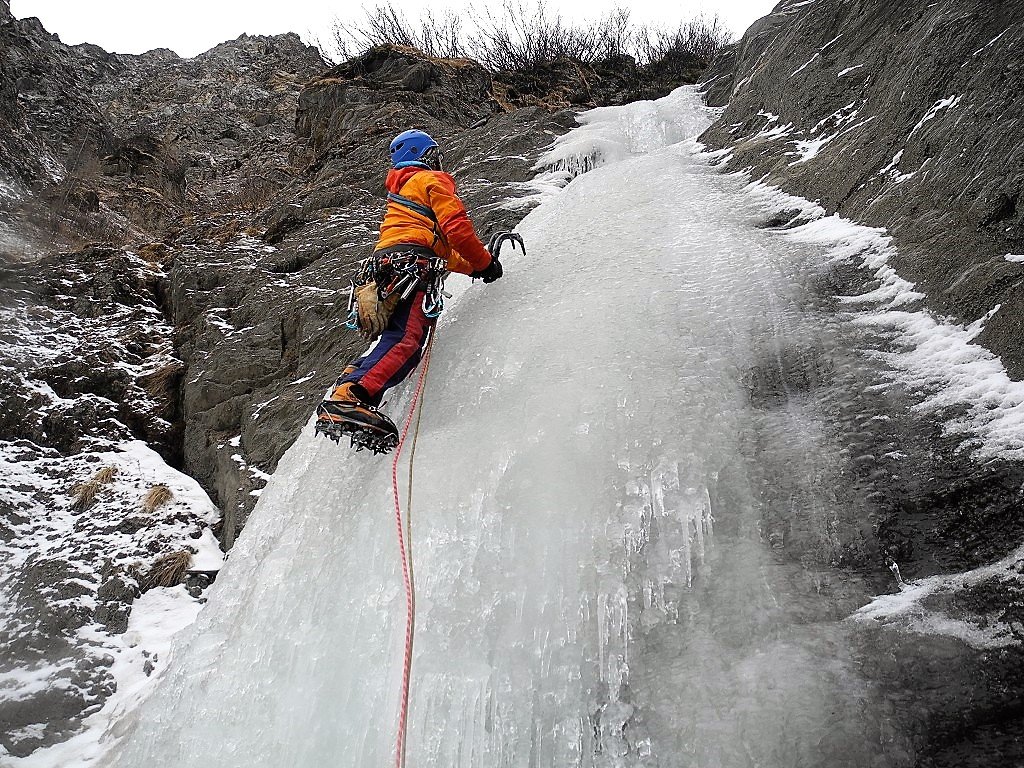 Mittels Abalakovschlingen über den Eisfall abseilen.