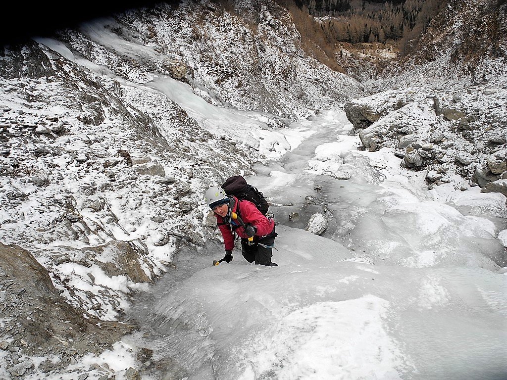 Vom Parkplatz bei der Stockerhütte nach Süden über die Brücke und dem Wanderweg west- und bergwärts Richtung Jamnigalm folgen, bis man erstmals den Eisfall linkerhand sieht. Nun über den zunächst baumfreien Rücken rechts des Grabens aufsteigen. Auf etwa 1700m steilt der Rücken auf, hier quert man in das Bachbett.