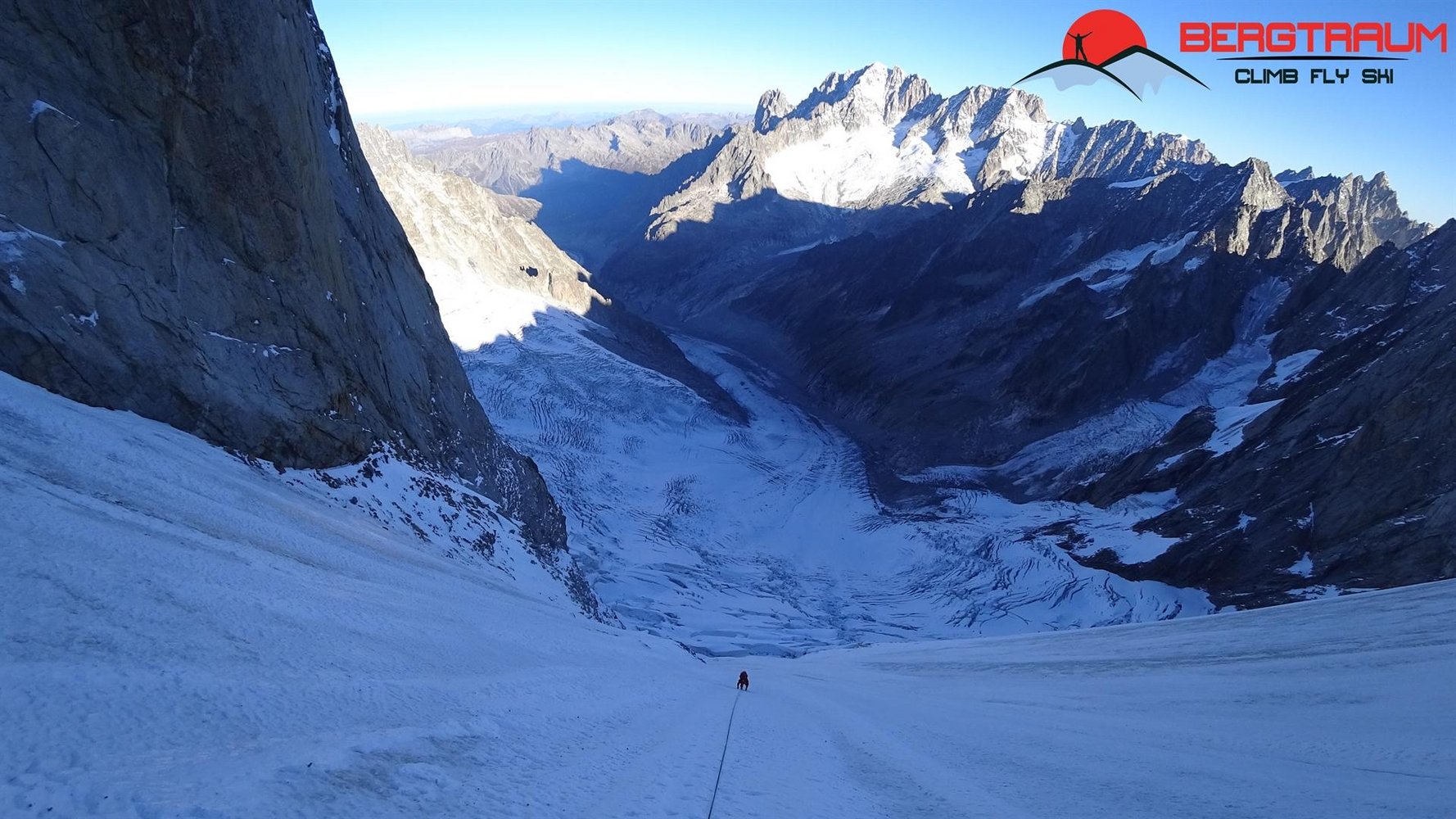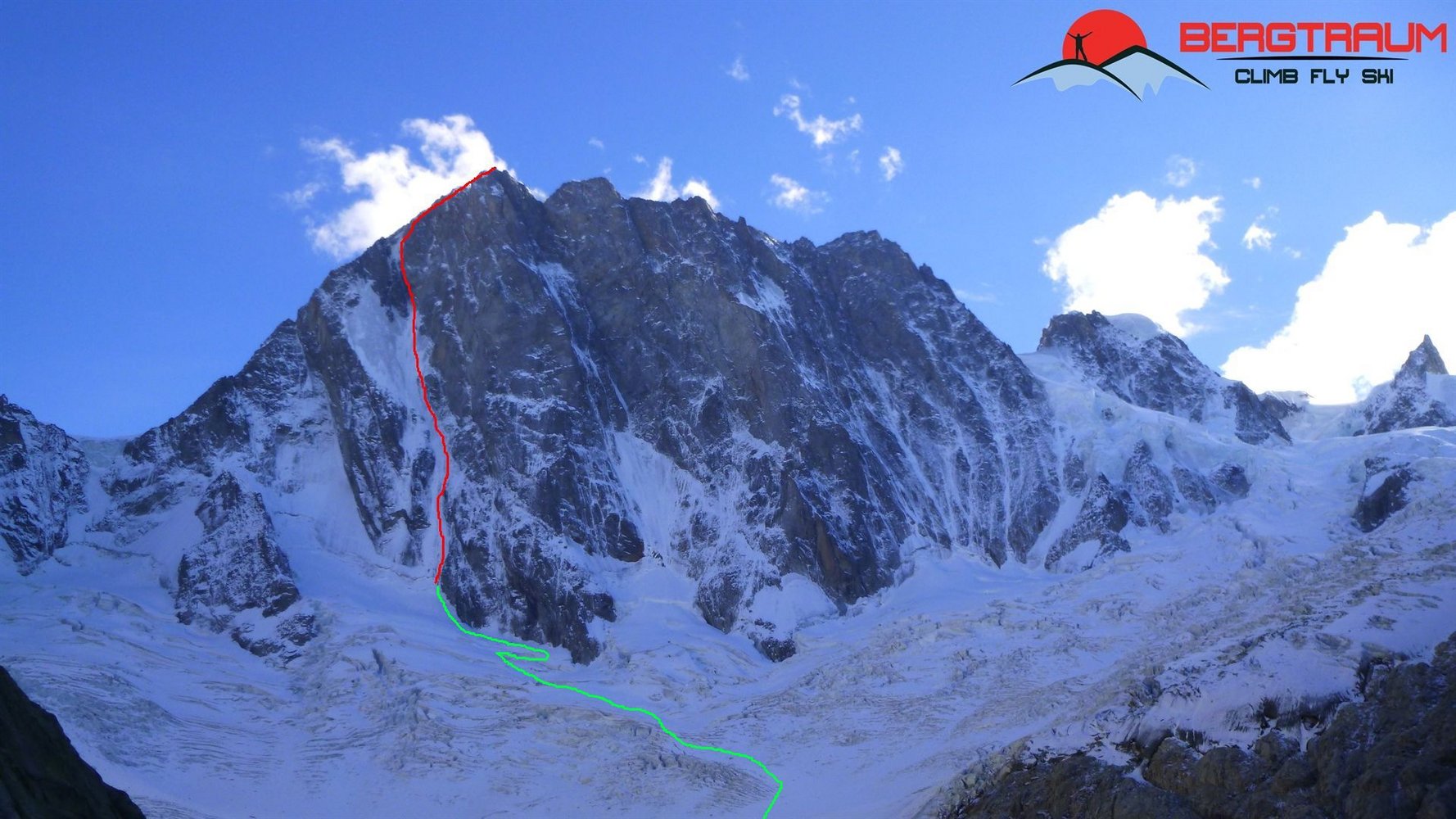Der lange Zustieg, die Abgeschiedenheit und der Anstieg selbst machen diese Tour zu einem absoluten Erlebnis in einer unvergleichlichen Umgebung. An diesem Berg gibt es keinen leichten An- und Abstieg. Die „normale“ Linie durch das Leichentuch folgt dem Eisfeld nach links auf den Hirondelles Grat (bei ca. 3800 m). Der Direktausstieg folgt einem markanten Gully gerade hoch, wendet sich dann nach rechts und endet erst bei knapp 4.100 m am Grat.
