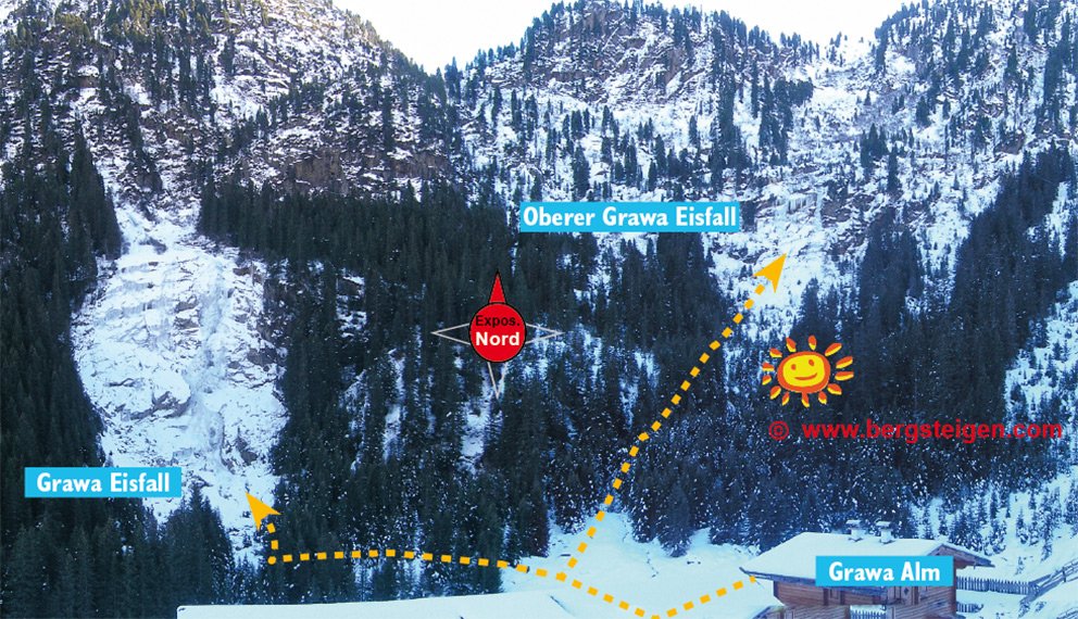 Der Grawa Eisfall ist einer der besten Anfängerfälle im Stubaital, der wegen der leichten Erreichbarkeit und Größe auch oft von Kursen besucht wird. Schöne Kletterei mit unzähligen Varianten bis zum 3ten Eisgrad möglich. Meist friert der Fall nicht ganz zu bzw. ist oft eine leicht störende Schneedecke vorhanden.