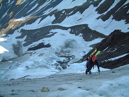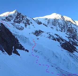 Die Routenfindung ist auf dem Hängegletscher nicht immer einfach, im Sommer und Herbst kann die Überwindung der einzelnen Seraks problematisch werden. Die Schlußwand im oberen Gletscherbecken apert leider immer schnell aus und es muß kurz im Fels geklettert werden.