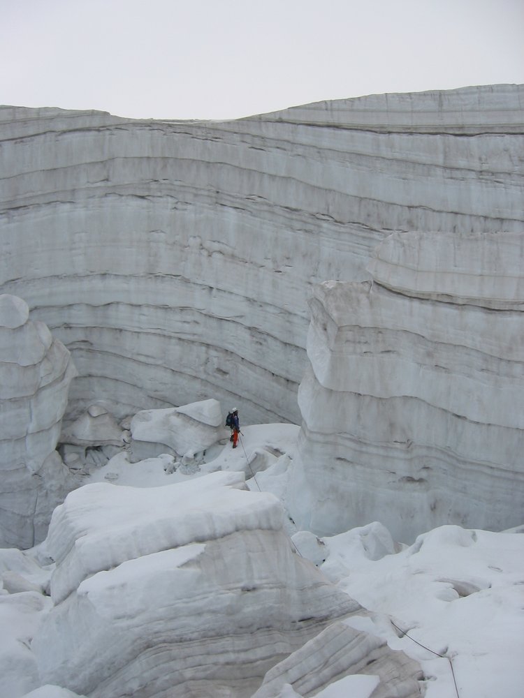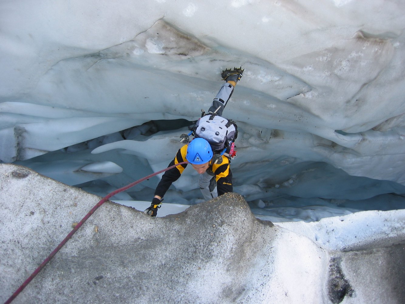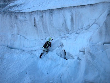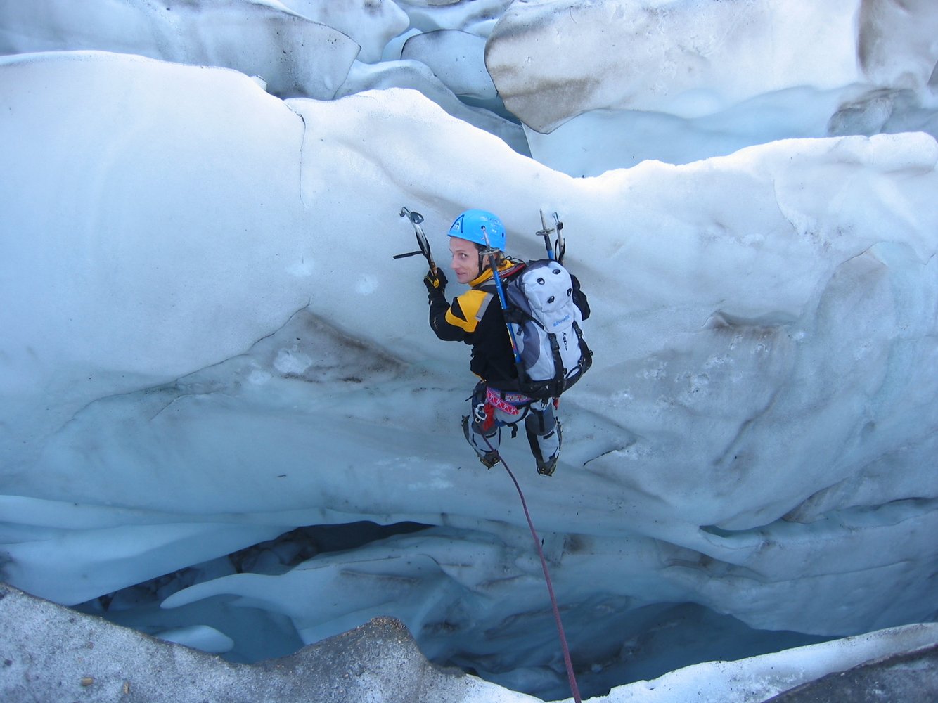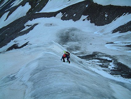Sicheres Gehen in steilen Eiswaenden ist erforderlich. Beim Mittelteil kann etwas Gespür für den leichtesten Durchschlupf nicht schaden. Gute Kondition insbesondere auch für den Abstieg, der nicht zu unterschätzen ist. Achtung bei Neuschnee auf Spalten beim Eisbruch!