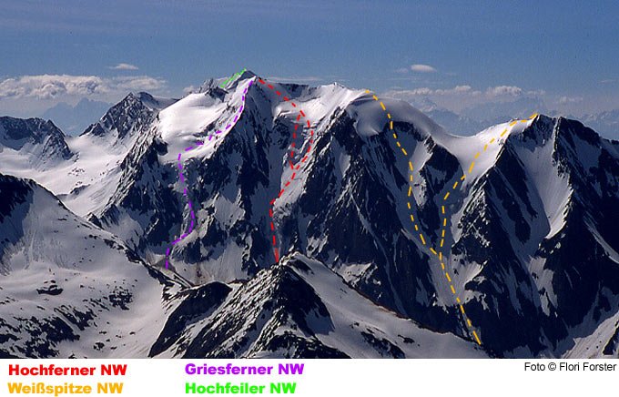 Die Hochferner NW ist ein bekanntes und beliebtes Ziel. Gleich links von ihr gibt es eine interessante Alternative. Der Griesferner ist ein abwechslungsreicher Anstieg bei dem die Schwierigkeiten je nach Verhältnissen variieren, von schöner Firntour im Frühjahr bis zu ernster Gletscherroute mit senkrechten Stellen im Sommer und Herbst.