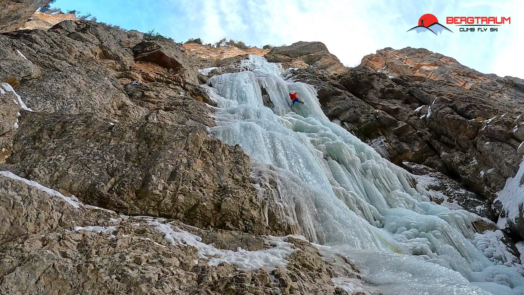 „Kleiner Prissianer Eisfall“, 80 m, WI 5+, Gesamt 2 SL: L1: WI 4+, 40 m. L2: WI 5+, 40 m;