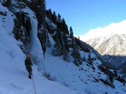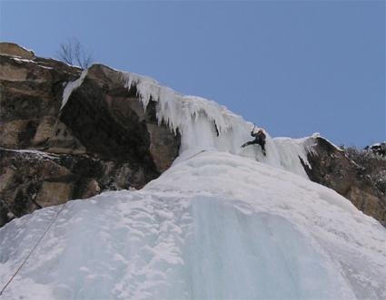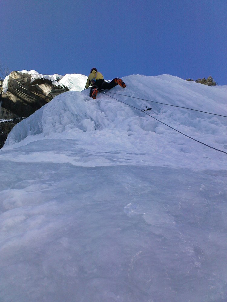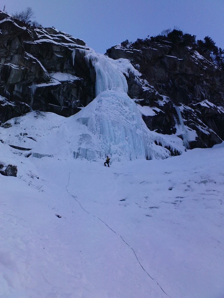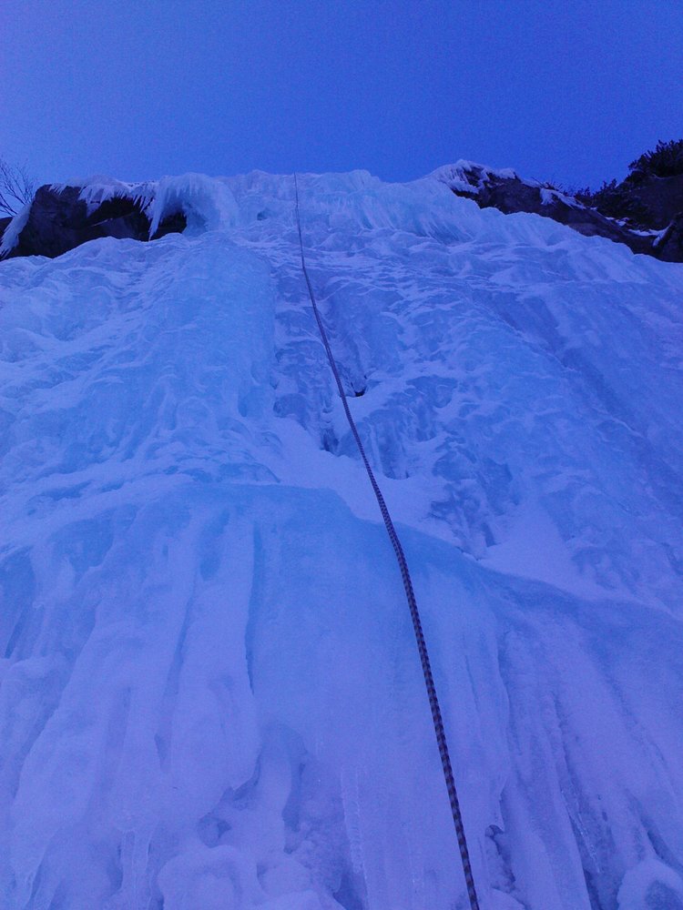 Kurzer, formschöner und steiler Eisfall der unübersehbar neben dem Weg liegt, nach einem flacheren Teil wartet oben ein steiles Finale auf den Begeher.
