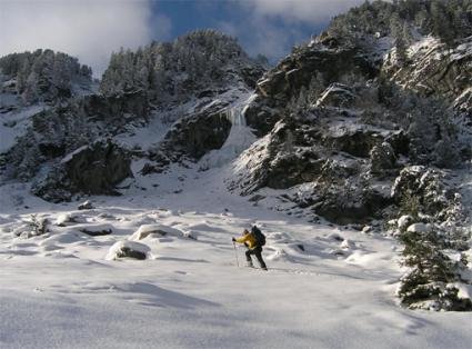 Mit Skiern oder Schneeschuhen durch den Sundengrund bis 10 min vor der Kainzenalm. Der Wasserfall ist vom Talgrund gut sichtbar. Dort über den Bach und steil empor bis zum Einstieg.