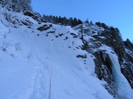Der Fall liegt in einem großen Lawineneinzugsgebiet und sollte nur bei sicherer Schneelage gemacht werden!