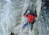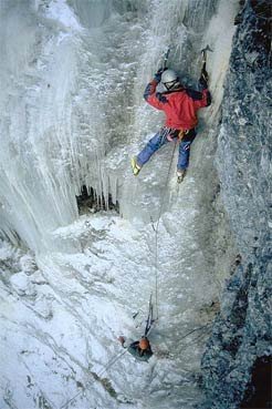 Rechts vom Wasserfall zuerst an einem Baum abseilen und dann beim ersten Stand von einer Eissaeule weiter hinunter. (Schlinge oder alte Schrauben mitnehmen).