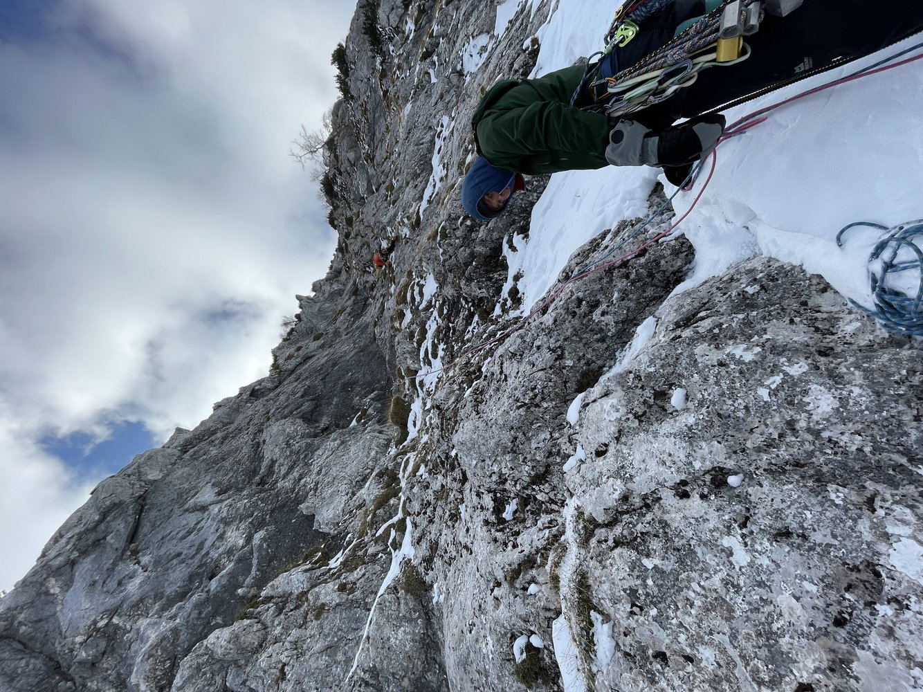 2. SL: kurzer steiler Aufschwung und Querung nach links in leichterem Gelände, jedoch schwierig Sicherungspunkte zu finden, Stand an zeeri belassenen Haken, ergänzbar durch gelben Totem. ca.30m, M4 (Bei der Erstbegehung wurden SL1 und 2 zusammengehängt)
