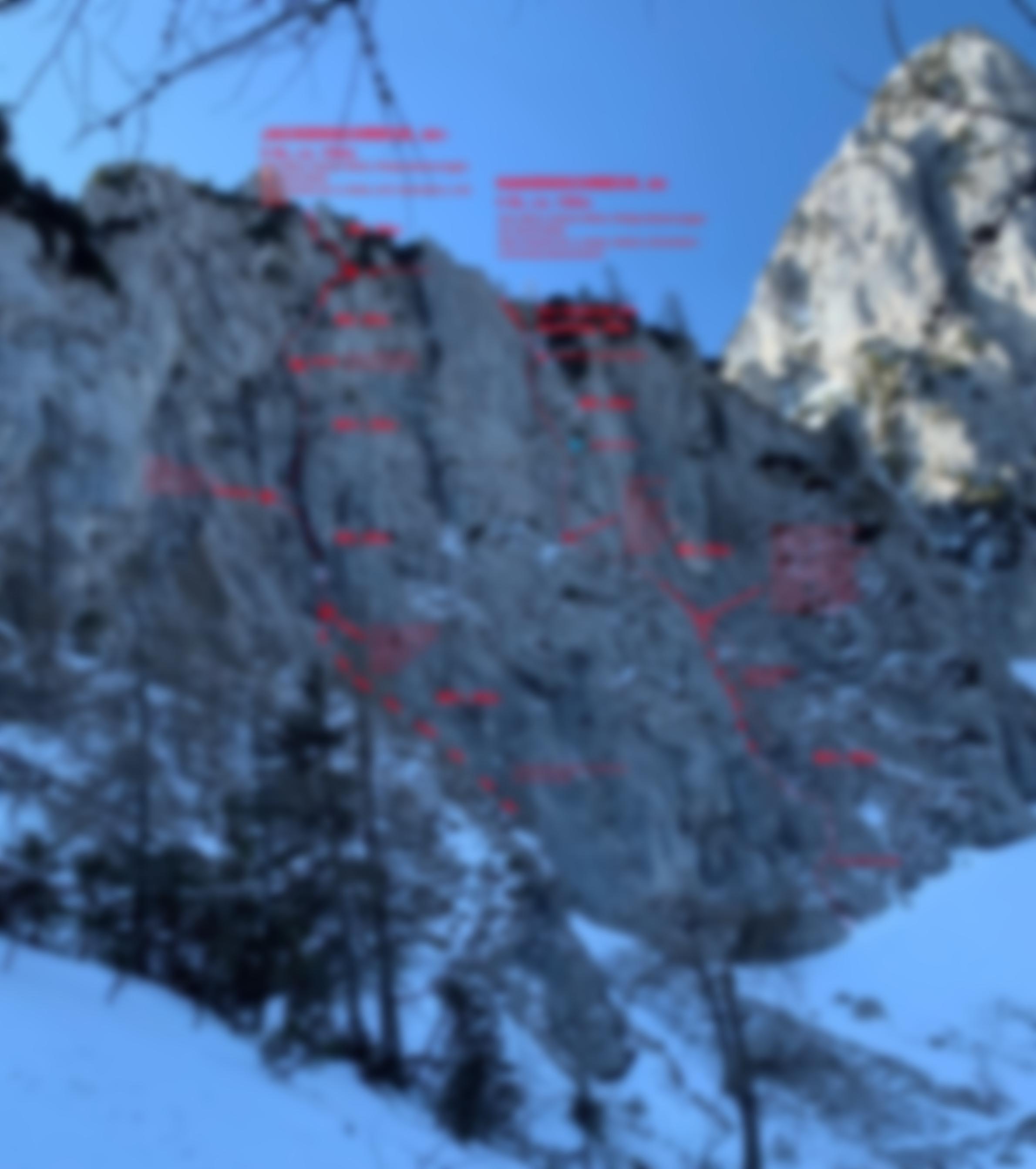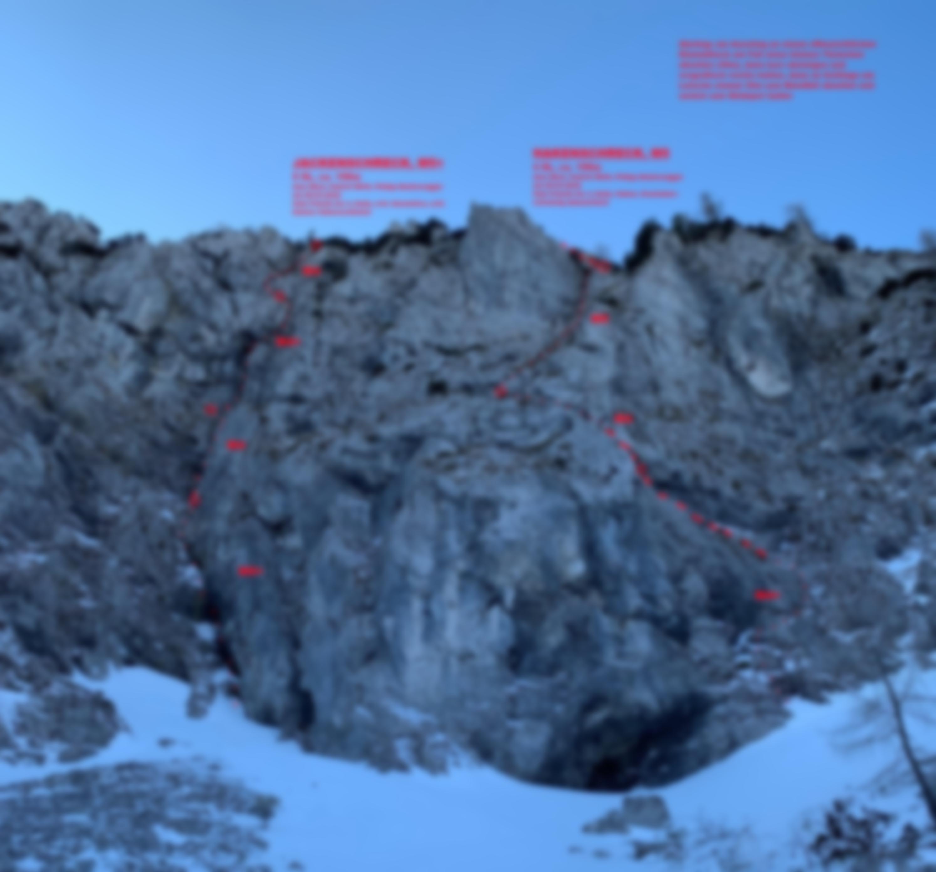 CAVE: Trotz der niedrigen klettertechnischen Schwierigkeiten muss man hier genau wissen was man tut und sollte den wenigen belassenen Schlaghaken nicht allzu sehr vertrauen! Es ist sicherungstechnisch absolute Eigeninitiative gefragt! Auf keinen Fall einsteigen, wenn das Gras nicht gefroren ist, sehr tiefe Temperaturen abwarten! Es wurde nach der Erstbegehung unsererseits kurz darüber nachgedacht die Tour zumindest mit gebohrten Ständen zu versehen. Wir wollen jedoch das Abenteuer potenzieller Wiederholer nicht schmälern, gut eingebohrte Mixedtouren gibt es in Bayern mittlerweile genügend. Im Vergleich zum "Jackenschreck" daneben ist die Absicherung im "Hakenschreck" seltener und schwieriger anzubringen. Hier sollten wirklich nur abenteueraffine Leute einsteigen - wer risikoärmer unterwegs sein möchte, sollte den unweit entfernten eingebohrten Redwitzkamin anvisieren.