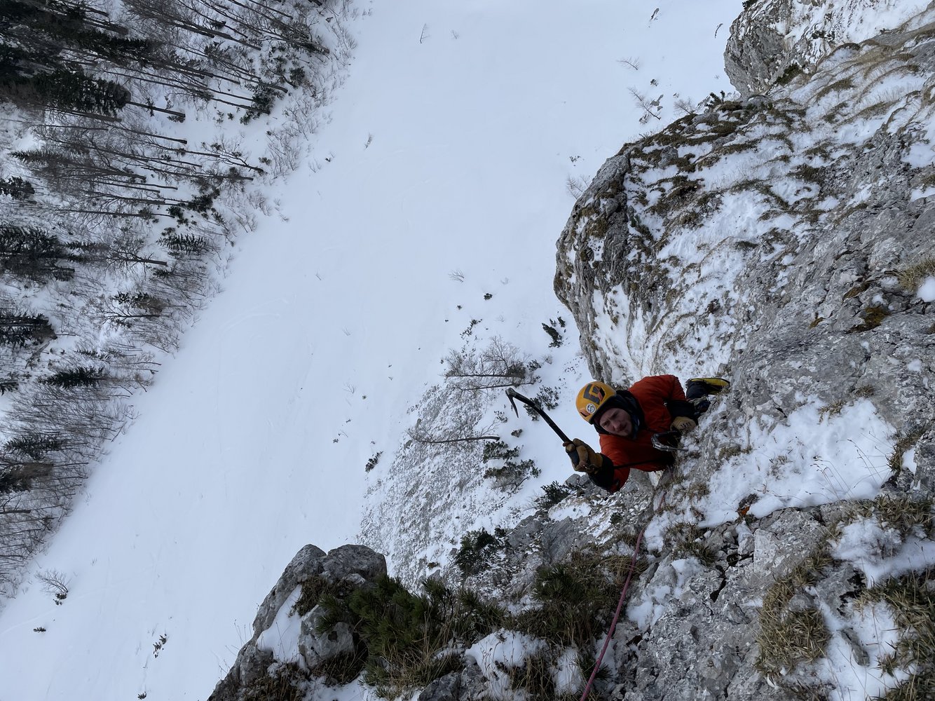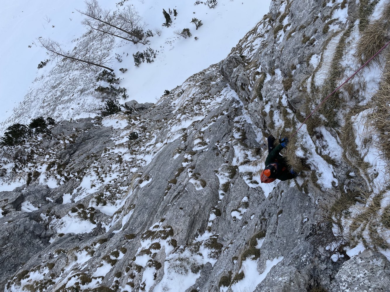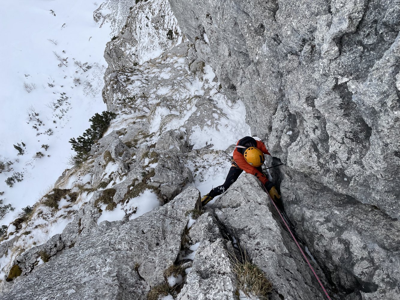 4. SL: Je nach Schneelage Stapfgelände oder Latschenkletterei bis zum Ende der Wand.