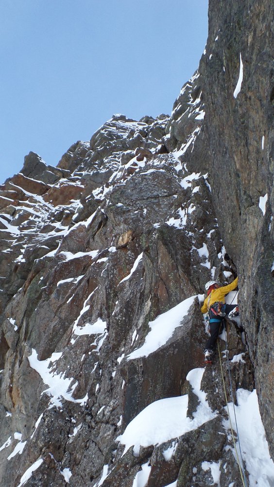 V , M6, 650m, der Fels ist bis zum zweiten Schneeband gut, der letzte Teil etwas brüchig, nur bei kalten Temperaturen ratsam.