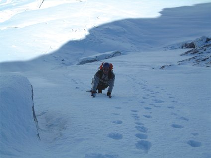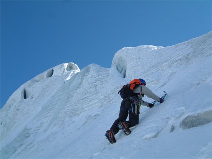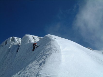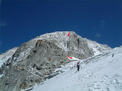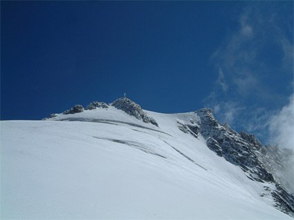 Über den Bergschrund und dann durch die Wand - man hält sich links um oben den Felsen etwas auszuweichen. Beim Ausstieg gelangt man auf einen Firngrat und kurz danach in ein Firnbecken. Über dieses zum Gipfelblock und über leichten Grat zum höchsten Punkt.