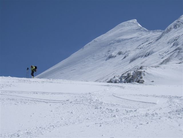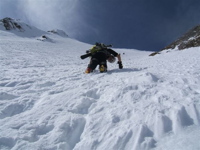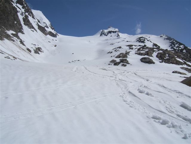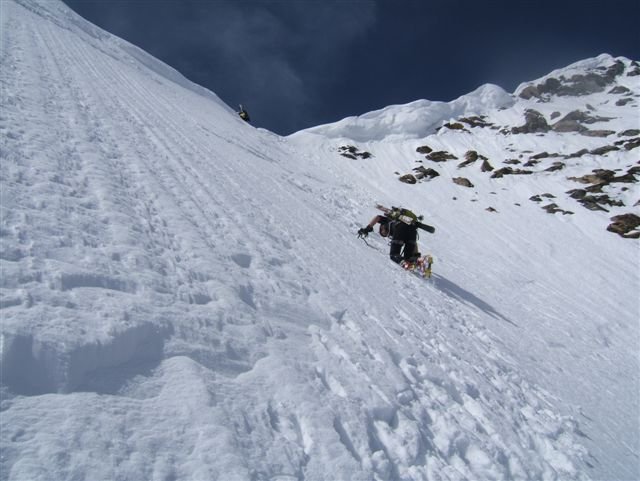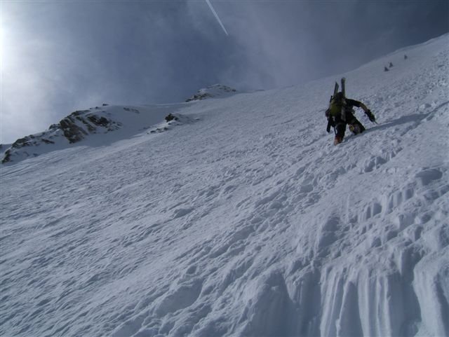 Im Frühjahr ist der zentrale Wandteil oft stark überwächtet, ein Wächtenbruch sollte je nach Temperatur und Jahreszeit einkalkuliert werden. Darum sollte der Anstieg orographisch mehr rechts bzw. überhaupt im rechten Wandteil durchgeführt werden.