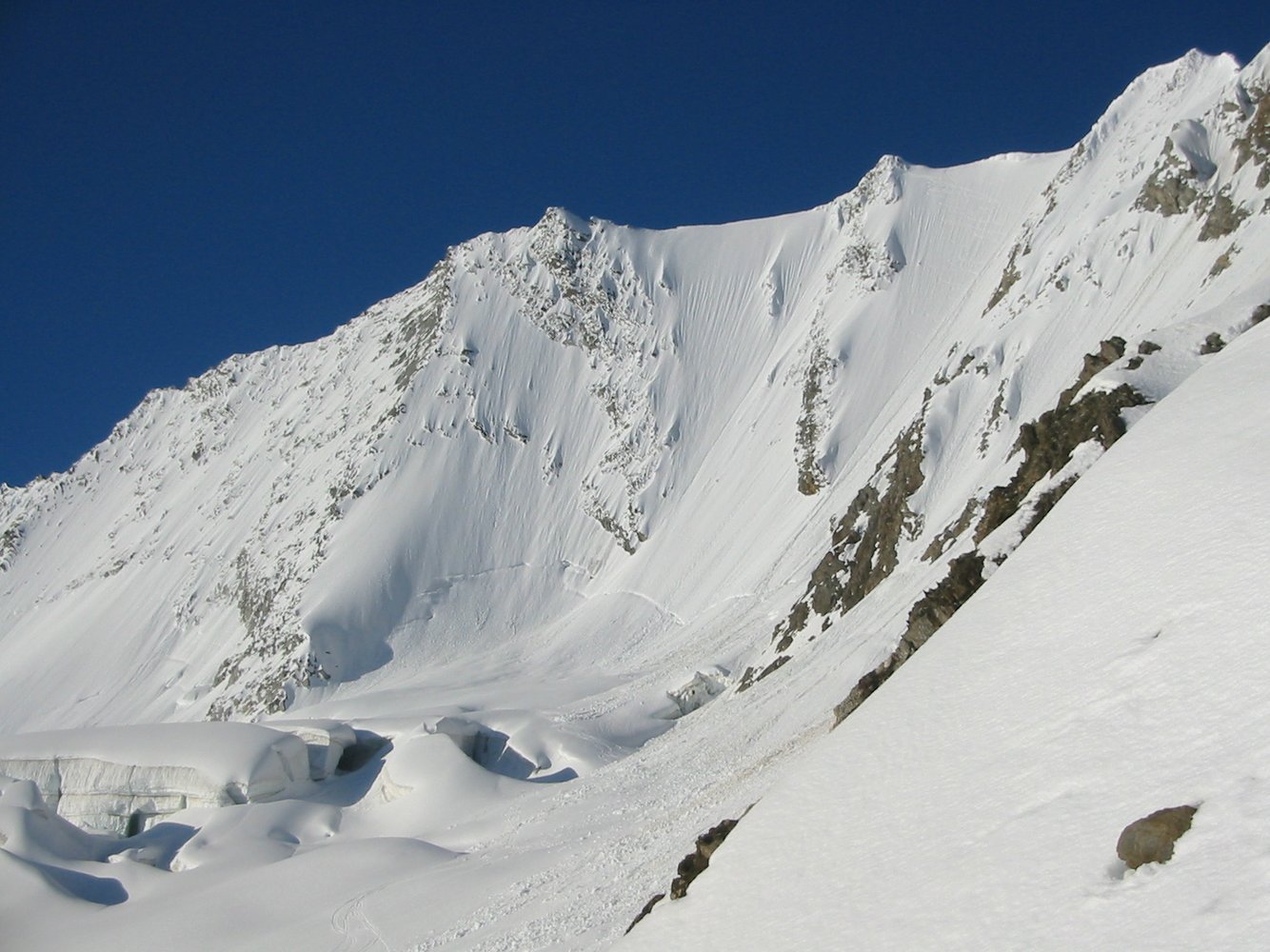 Schöne Eiswand mit 330 m Höhe, bis 55° steil, oben hat es meist eine große Wechte (objektiv nicht ungefährlich!)