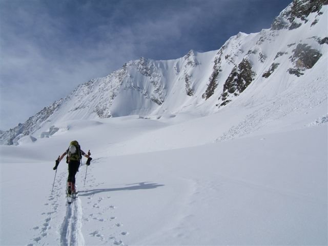 Klassische Eistour wobei die Schwierigkeiten nicht im Eis liegen. Es wird eher eine gute Kondition gefordert durch den langen Zu- und Abstieg. Empfehlenswert im Frühjahr als Kombination Schi- u. Eistour, wodurch der lange Abstieg extrem verkürzt wird. Stimmen die Schneeverhältnisse (Firn), kommt man nach Durchsteigung der Wand zu einer ca. 1500 Hm langen Abfahrt über mässig geneigte Gletscher und Firnhänge.