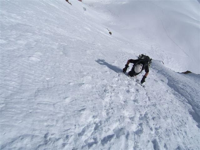 im Sommer und Herbst ist die Wand meist nicht im optimalen Zustand, die Randkluft kann ein großes (90°) Problem werden. Sicheres Gehen in steilen Eiswänden!!