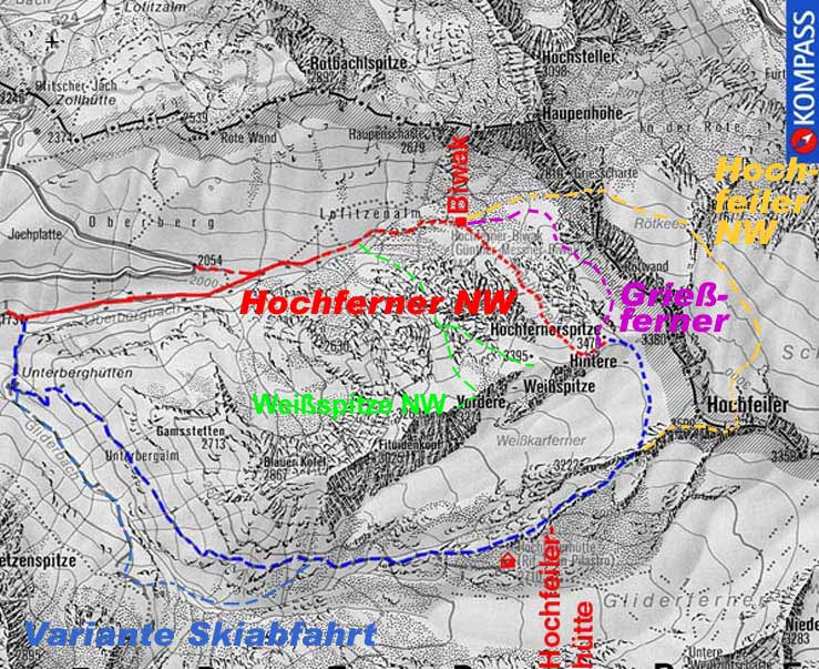 Vom Parkplatz der Hochfeilerhütte in ca. 1 Std. zum Hochferner Biwak im inneren Oberbergtal (nach ca 5 Minuten links zu Almen abzweigen bei einem Wegschild); oder einige Kehren weiter hinauf und in einer großen Linkskurve PKW abstellen. Obwohl das Biwak im Jahr 2000 erneuert und vergrössert wurde ist es sehr oft überfüllt, dann ist es besser beim PKW zu schlafen und am nächsten Morgen sehr früh aufzubrechen. Von der Biwakschachtel steigt man zur der markante Scharte P. 2818 m (AV-Karte) südlich der eigentlichen Grießscharte (2810 m) auf, hinten ca. 100 Hm auf das Rötkees hinunter und nach rechts (ostwärts) über dieses leicht ansteigend bis zu einem weiteren Felsriegel. Den Felsgrat in einer der kleinen Scharten überqueren und mit geringem Höhenverlust auf das Schlegeiskees. Weiter über den Gletscher bis unter die Wand queren.