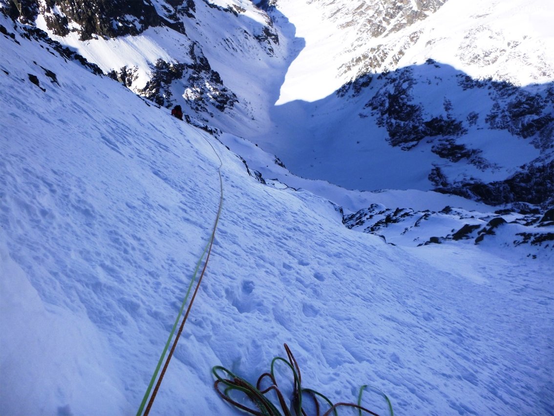 Es ist schwierig, in diesem kompakten, geschlossenen (oft brüchigen) Fels Sicherungen anzubringen. Sehr wenige Hakenritzen, Risse für einen Keil oder Friend, kein Köpfel. Trotzdem empfiehlt sich die Mitnahme eines Hakensortiments und kleiner Camalots 0,3 bis 0,75. Langer, nicht zu unterschätzender Abstieg. Bei Lawinengefahr den Tagesgang beachten- der Abstieg auf der Südseite ist dann heikel.