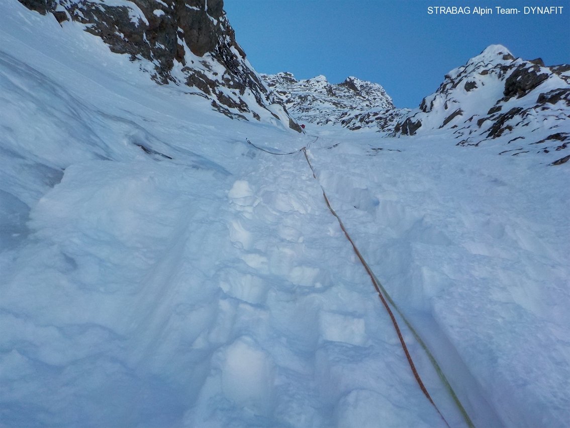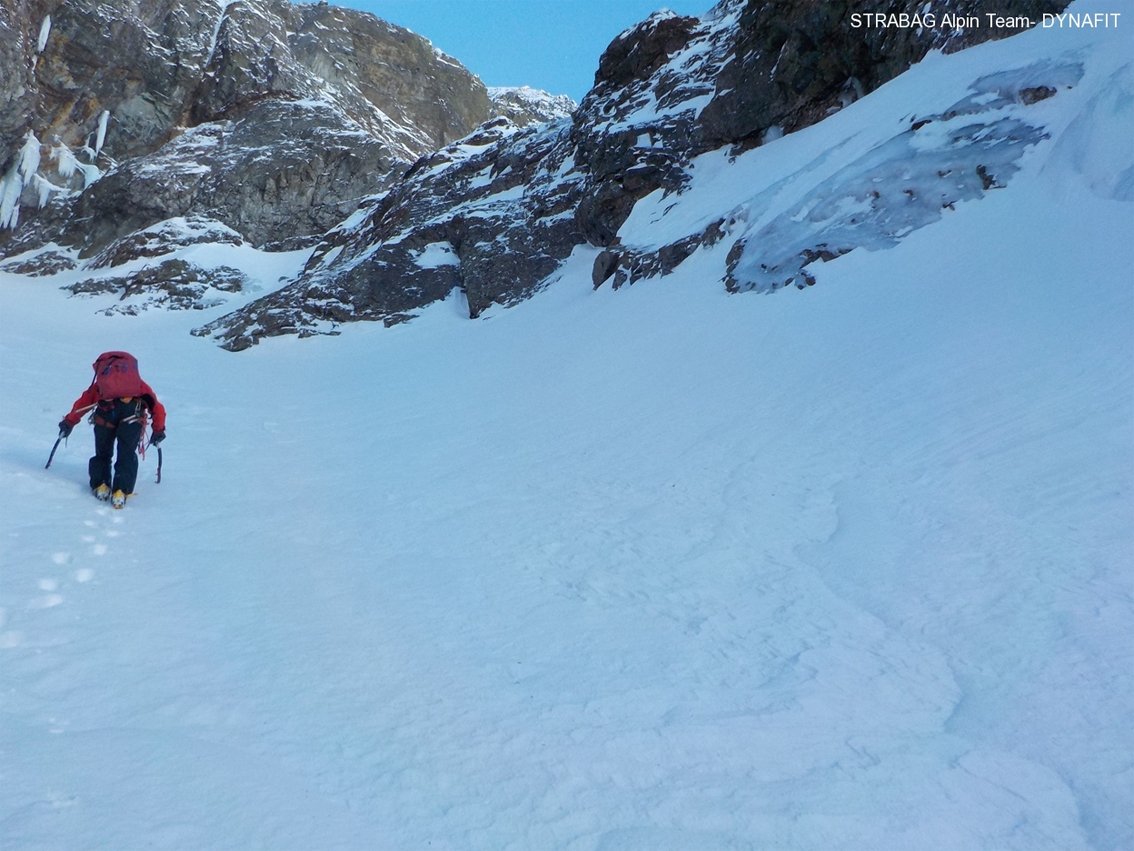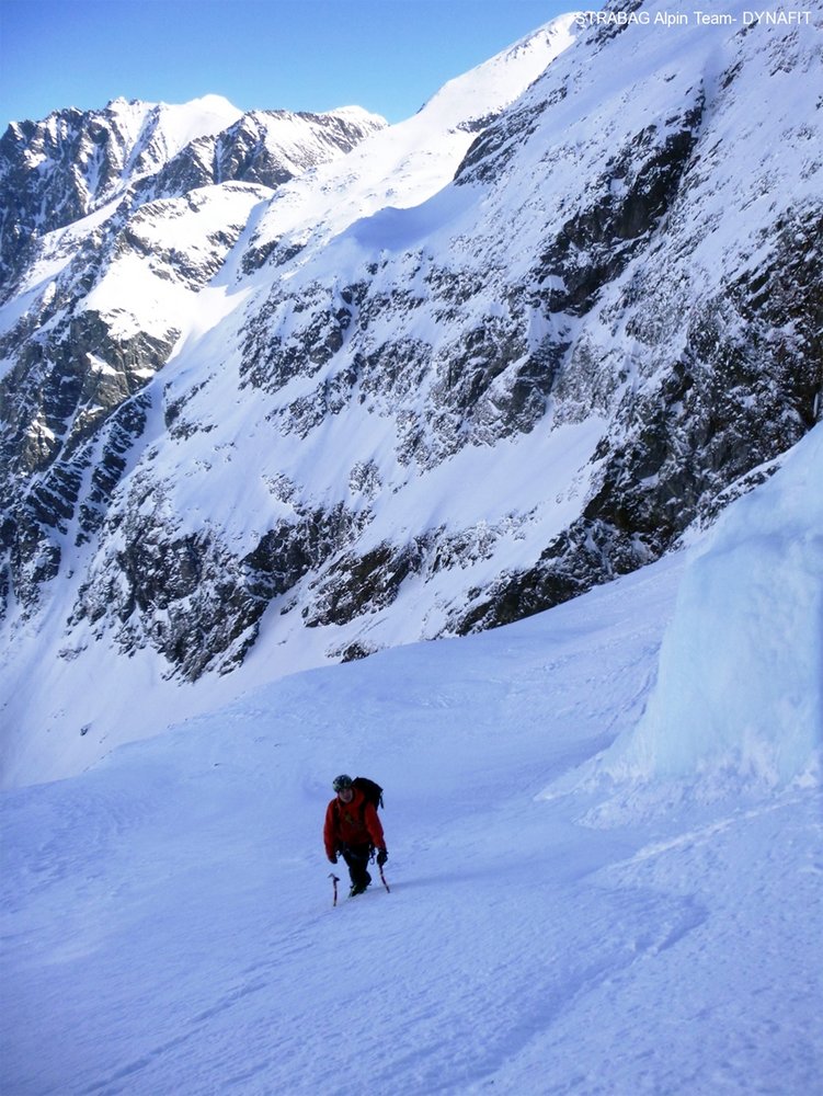 Eine sehr selektive Traumtour für den kompletten Alpinisten! Der lange Zustieg, die Abgeschiedenheit und der Anstieg selbst machen diese Tour zu einem absoluten Erlebnis in einer unvergleichlichen Umgebung. Lawinengefährlicher Zustieg im sehr engen Gollingwinkel. Mehrere Aufstiegsmöglichleiten in der Wand: generell gilt der rechte Teil als etwas leichter als der linke Wandabschnitt.