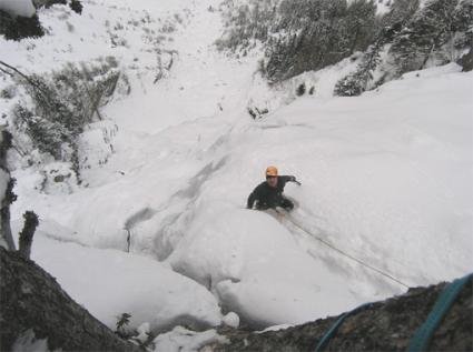 Am Ende der 3ten Seillänge rechts an einem Baum auf eine Kuppe abseilen, dort erneut in einen Graben abseilen und zu Fuß bis zu einer Steilstufe absteigen (man kann je nach Schneeverhältnissen auch gleich von oben in den Graben abseilen - bei wenig Schnee besser noch mal von der Kuppe), hier erneut kurz abseilen.